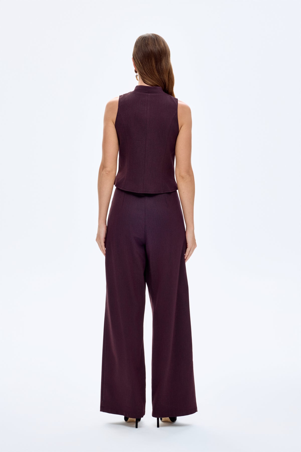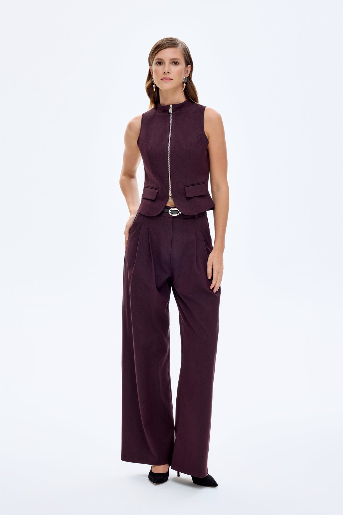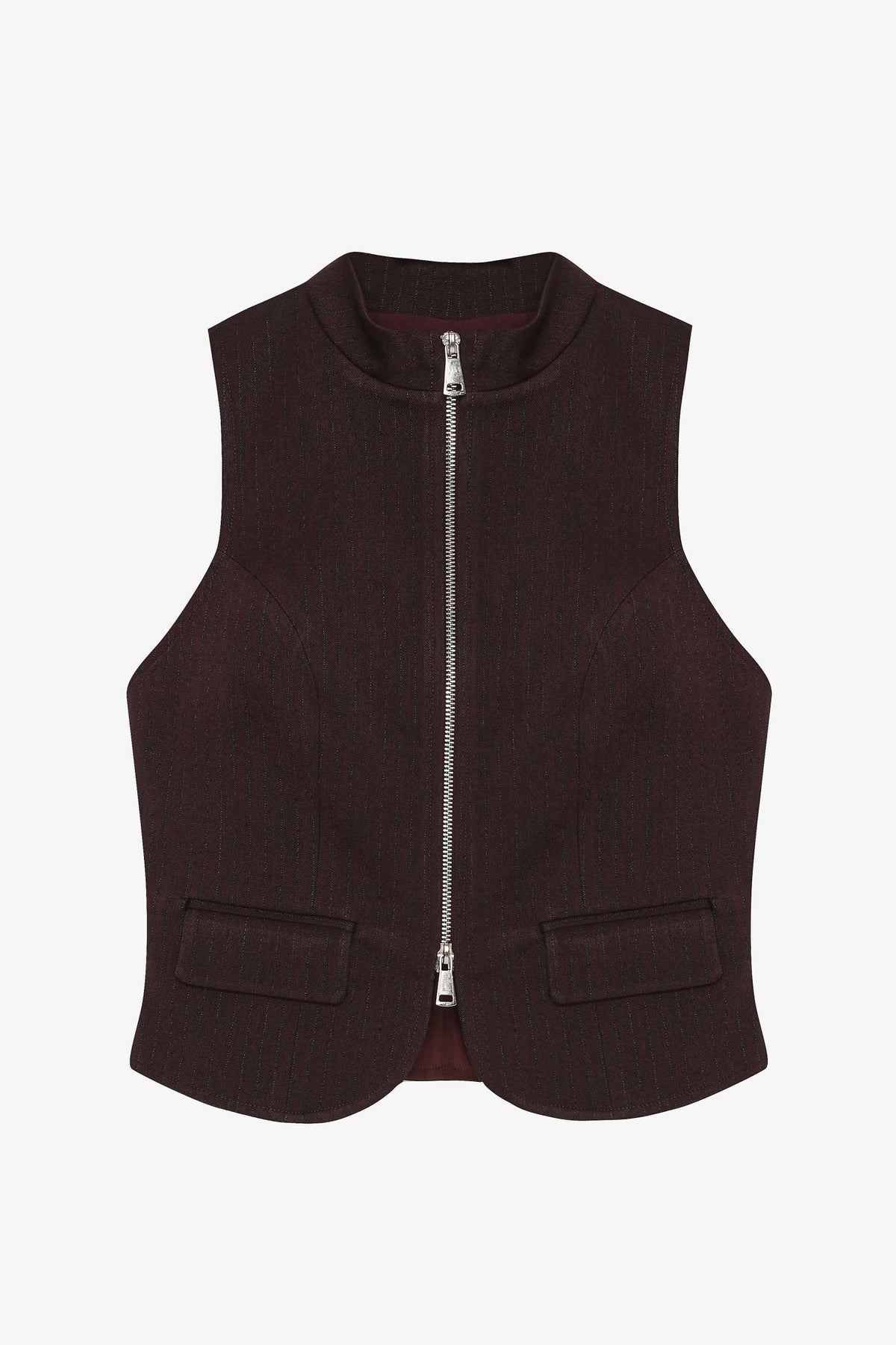 Yuvarlak dik yaka, ön kısmı fermuar detaylı, lacivert çizgi desenli, içi astarlı, cep kapaklı, kolsuz, alt kısmı oval kesimde, vücüda oturan formda, crop boy bluz.