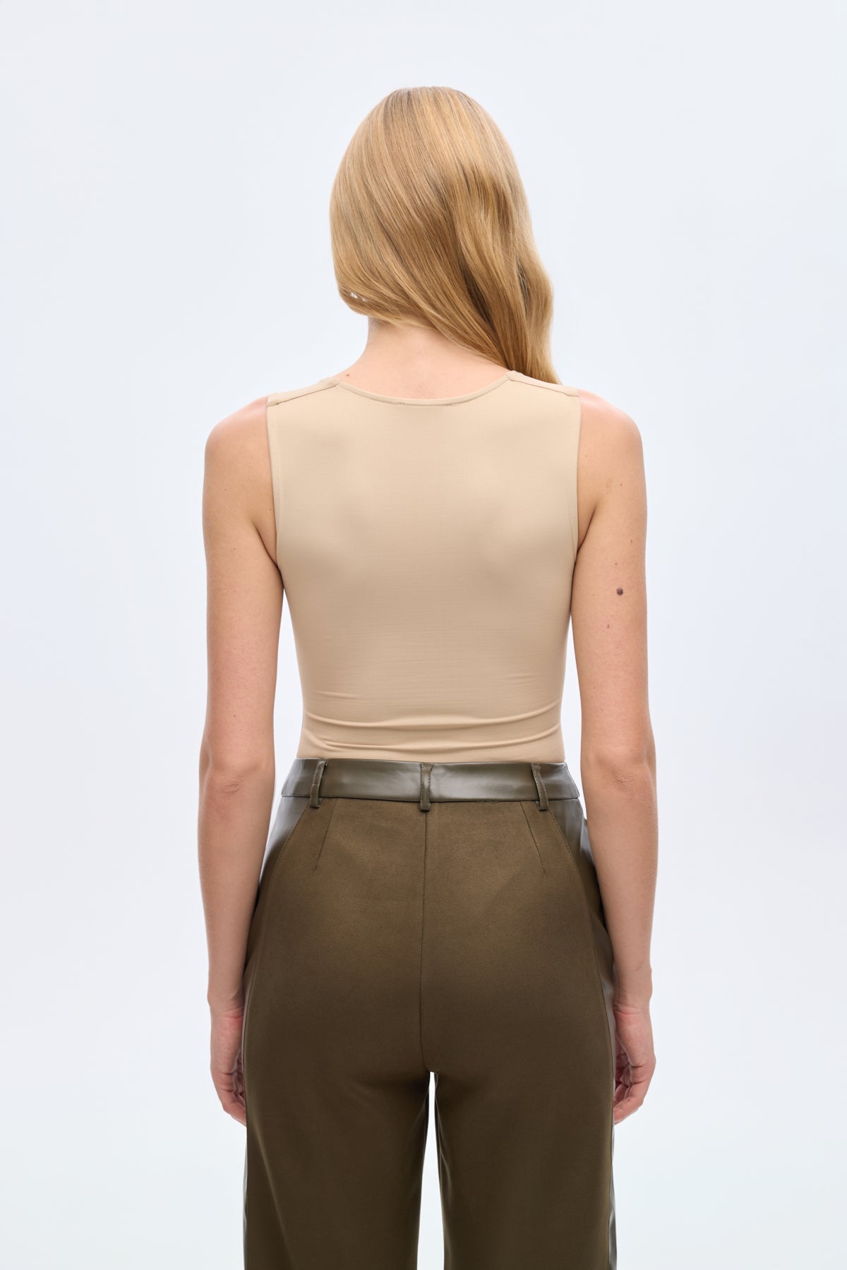 Kare yaka, kalın askılı, göğüs kısmı yarım astarlı, esnek kumaş dokulu, alttan çıtçıt kapamalı, modern görünüm sunan basic bodysuit.