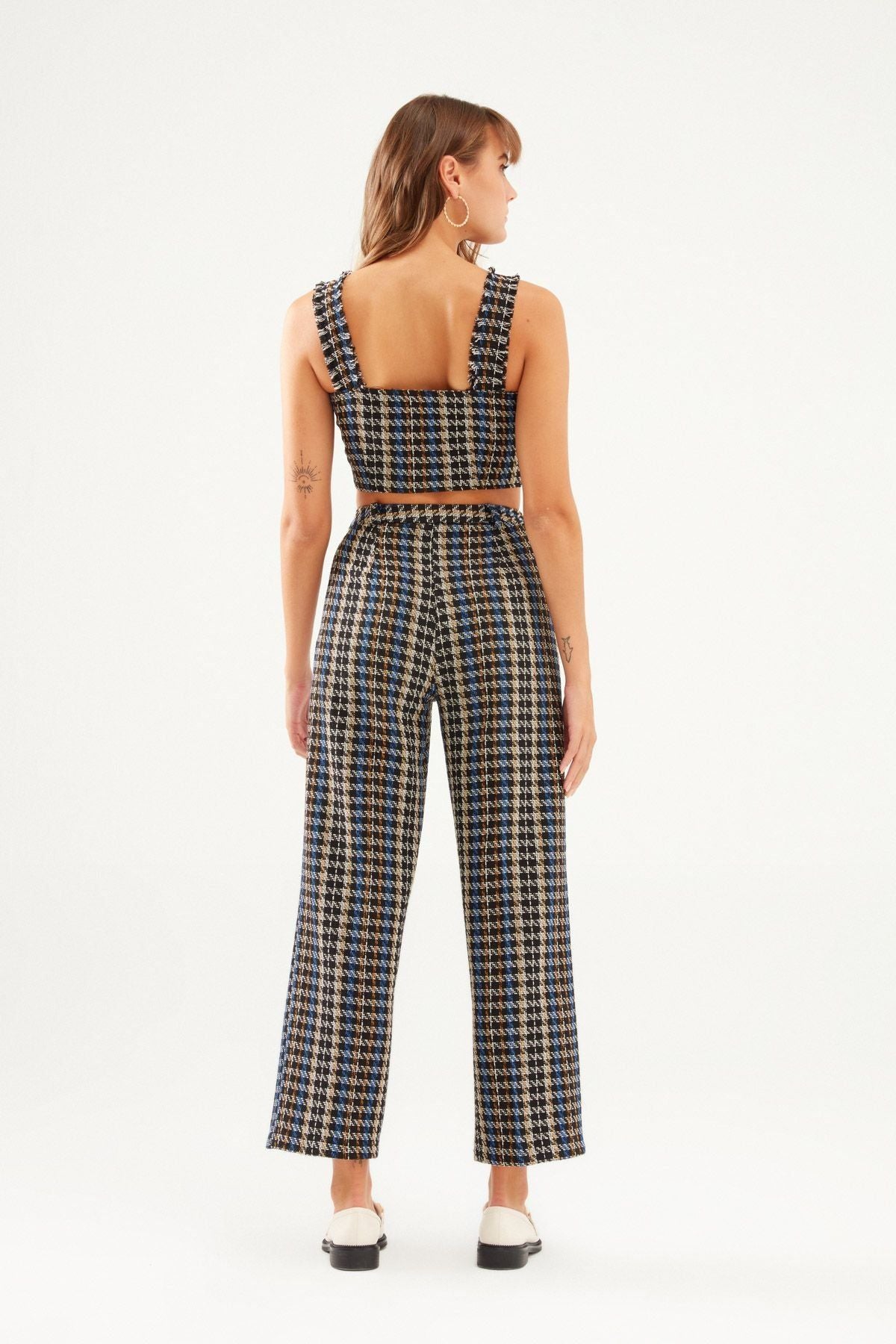 The women's double-leg tweed trousers model looks very stylish with the accessory detail on the waist. You can reflect your style thanks to the abundant pattern you can reach for comfort.