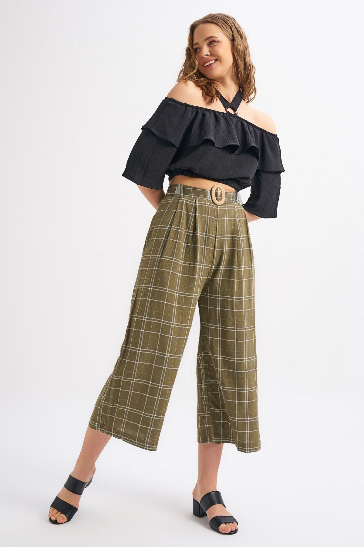 Belt Detailed Plaid Linen Trousers Khaki