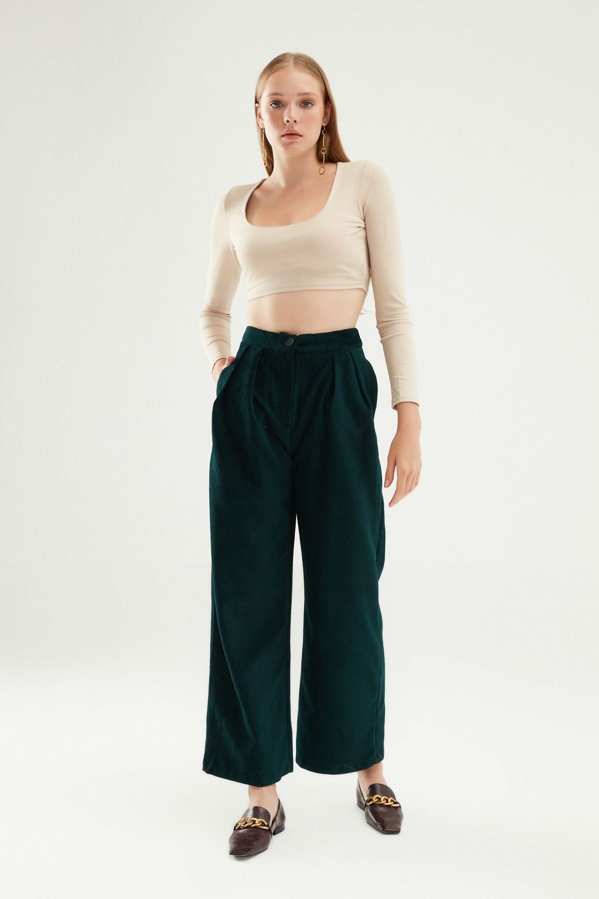 You can combine the corduroy trousers model, which looks more elegant with its ribbed texture, with a blouse and sweater. You can bring your pleated feature to the fore by combining it with a cropped blouse. The velvet trousers model, which provides comfort with its loose fit and pocket feature, will give a different atmosphere to the winter combination.