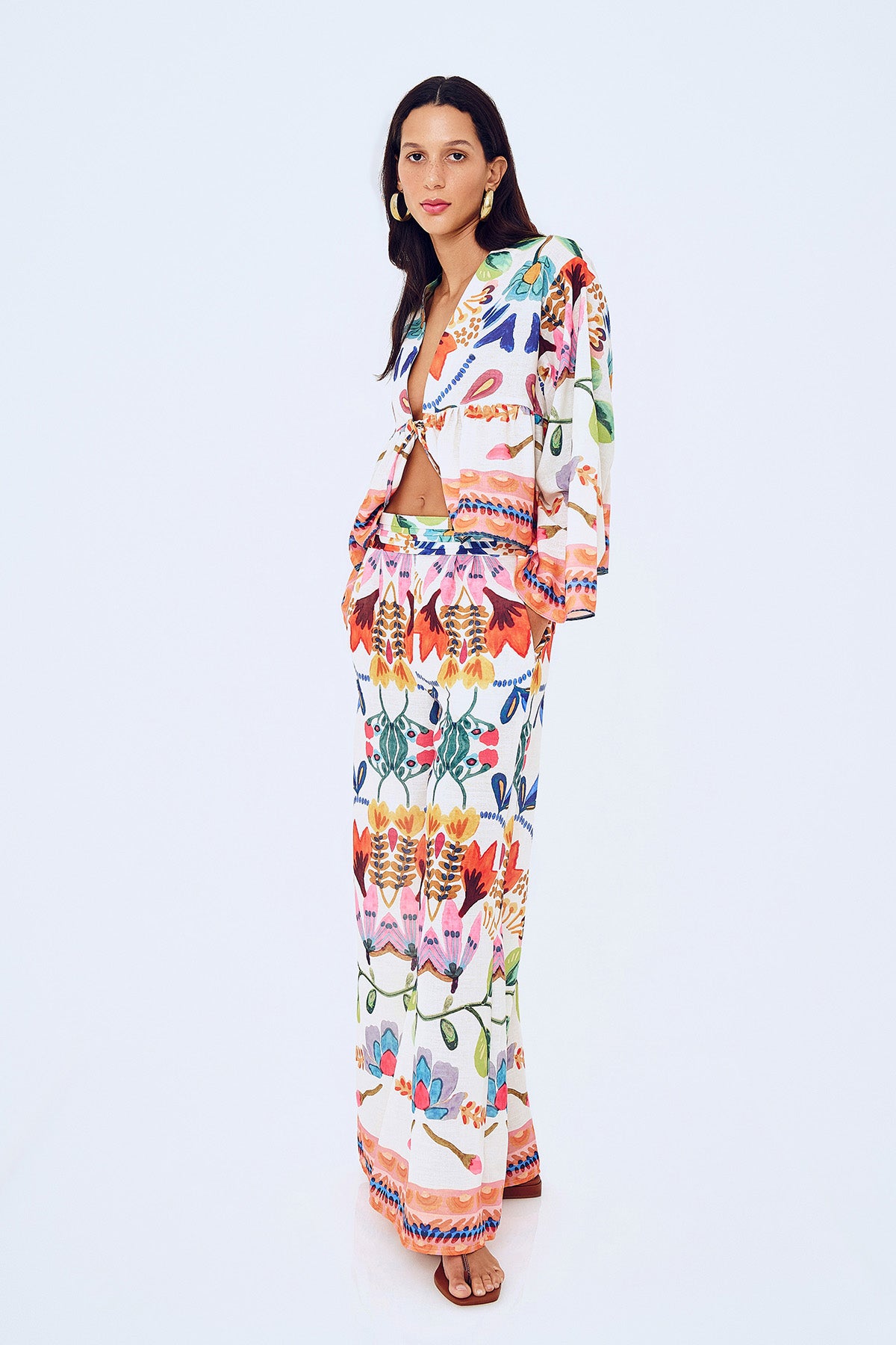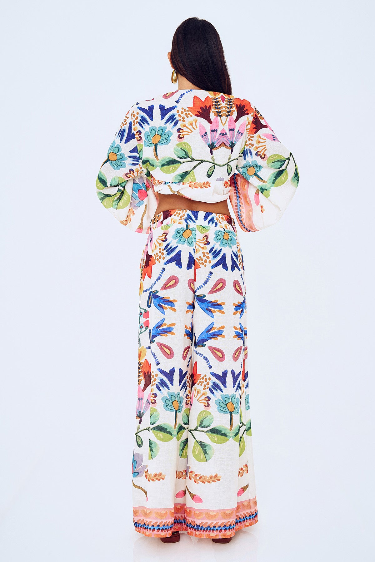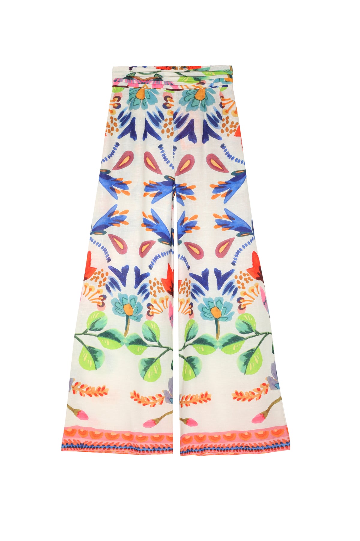 Geniş paçalı, yüksek bel, cepli, renkli ve çiçek desenli detaylara sahip pantolon.