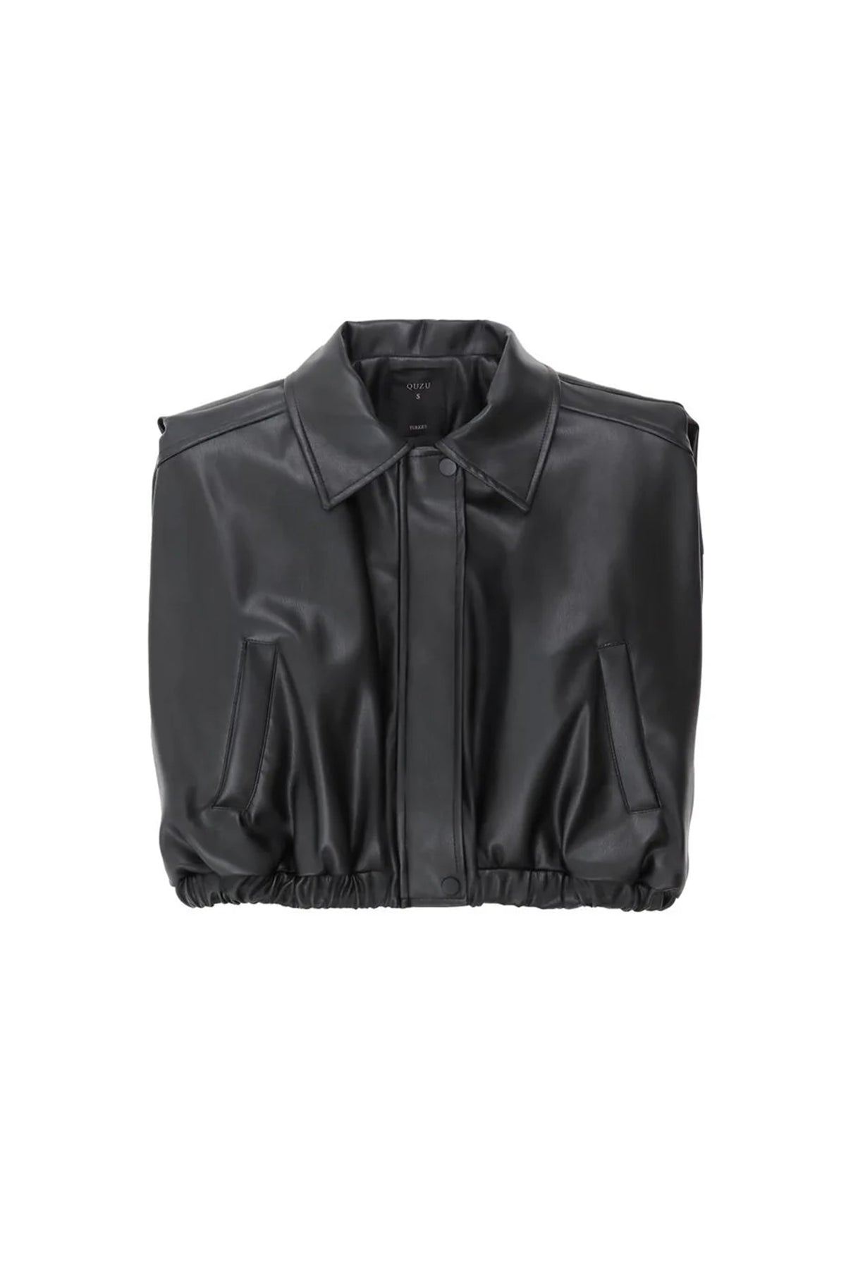 önden fermuarlı, çİft ceplİ, belİ lastİklİ, kolsuz, derİ bomber ceket.