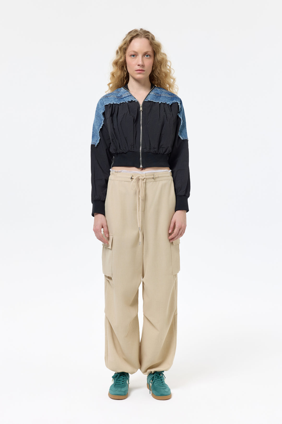 Denim Detaylı Püsküllü Bomber Ceket Siyah