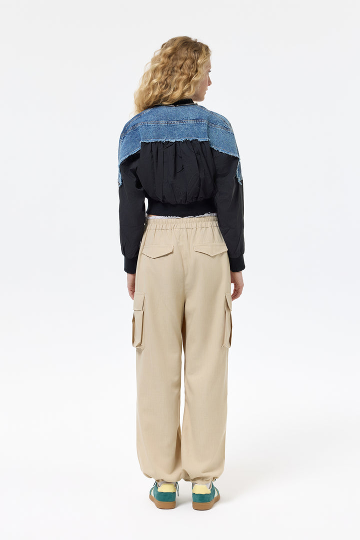 Omuzları denim püskül detaylı, fermuarlı, uzun kollu bomber ceket.