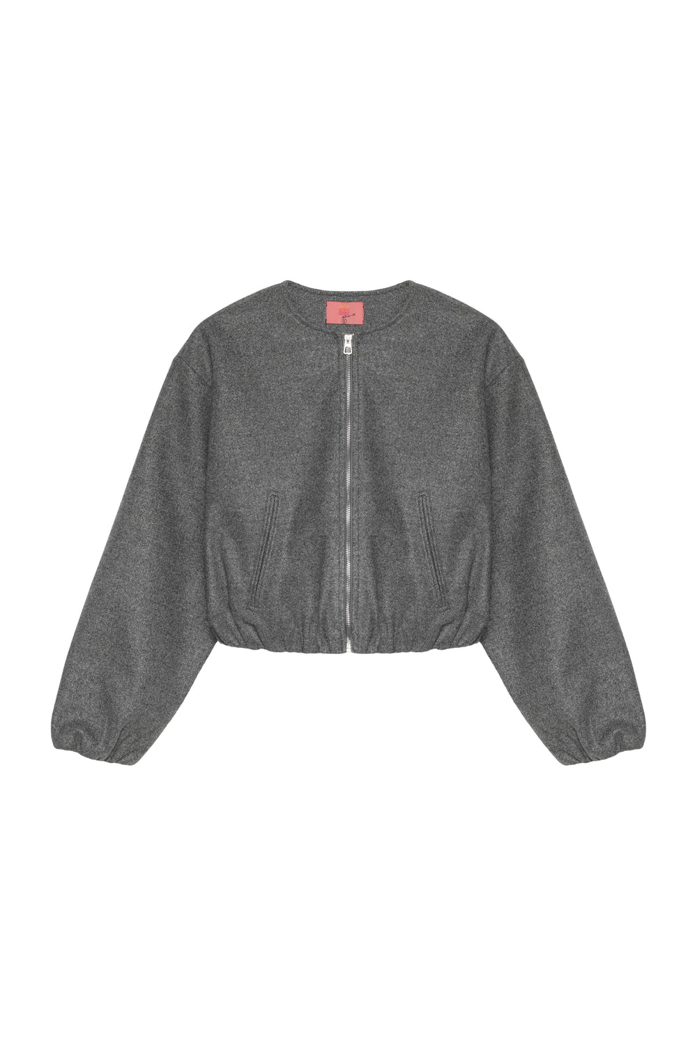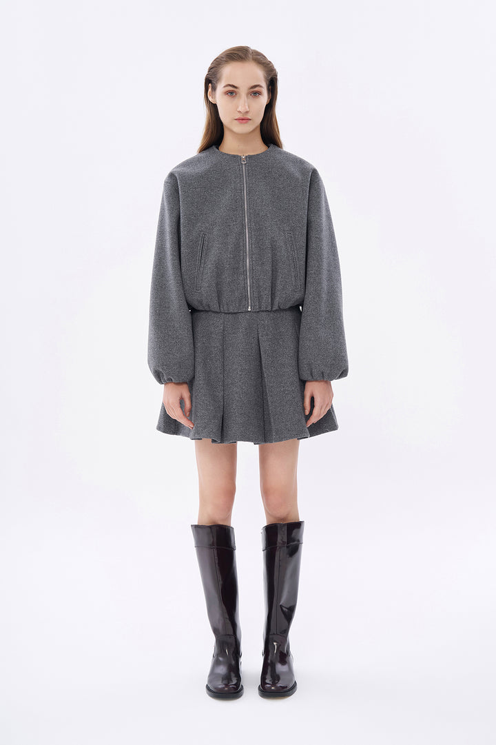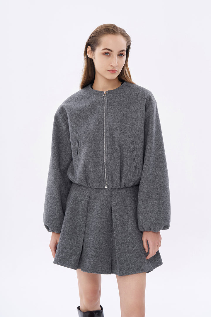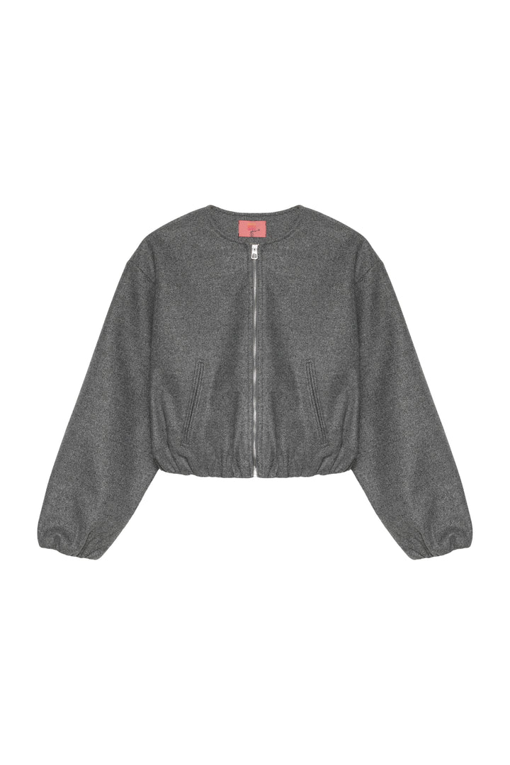 İçi astarlı, yuvarlak yaka, ön kısmı fermuarlı, balon kollu, beli ve kolu lastikli, kaşe bomber ceket.