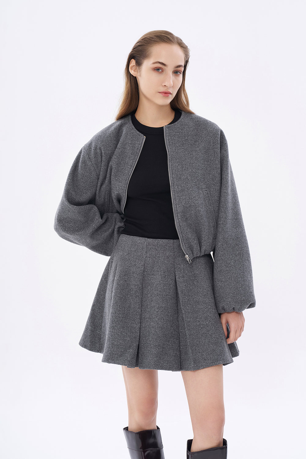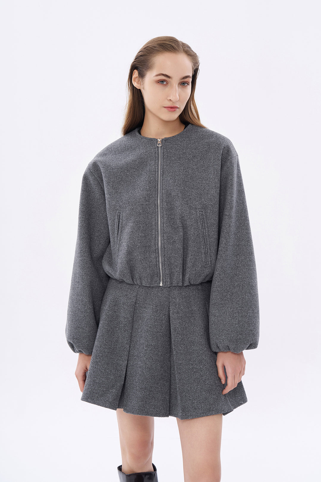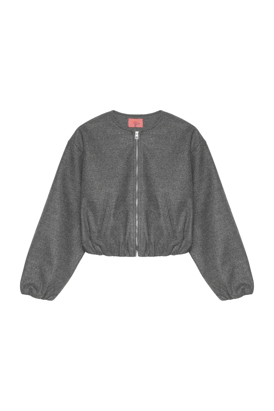 İçi astarlı, yuvarlak yaka, ön kısmı fermuarlı, balon kollu, beli ve kolu lastikli, kaşe bomber ceket.