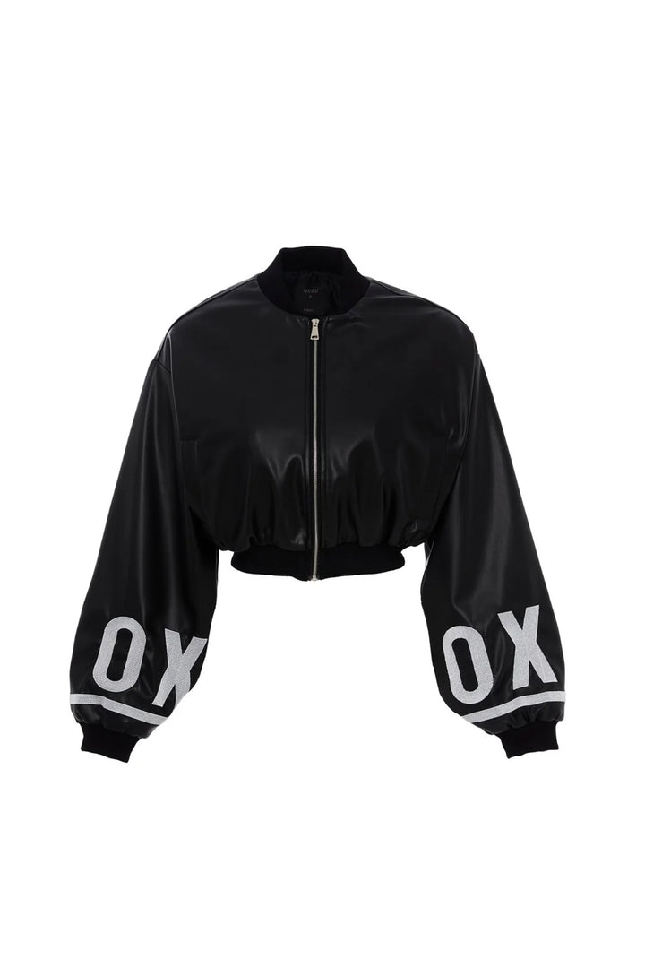 Önden fermuar detaylı, kolları baskı detaylı, çift cepli, deri bomber ceket.