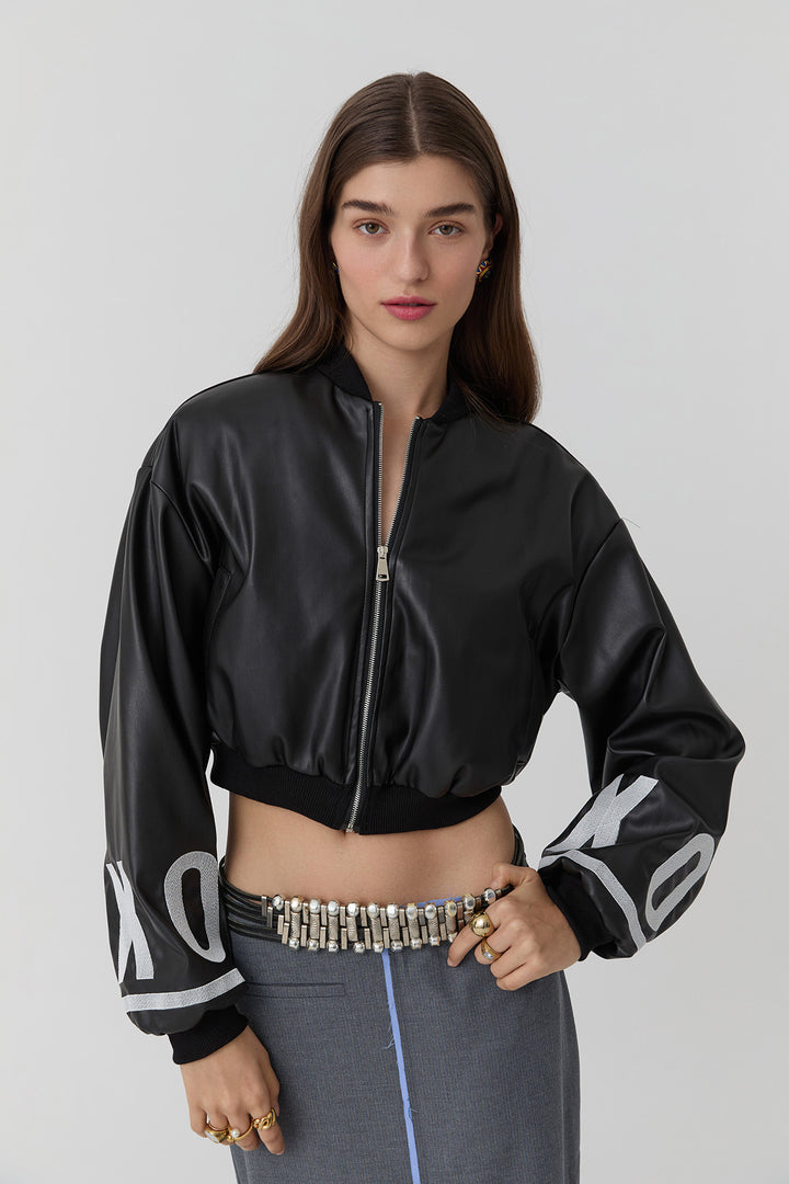 Kolu Baskılı Deri Bomber Ceket Siyah