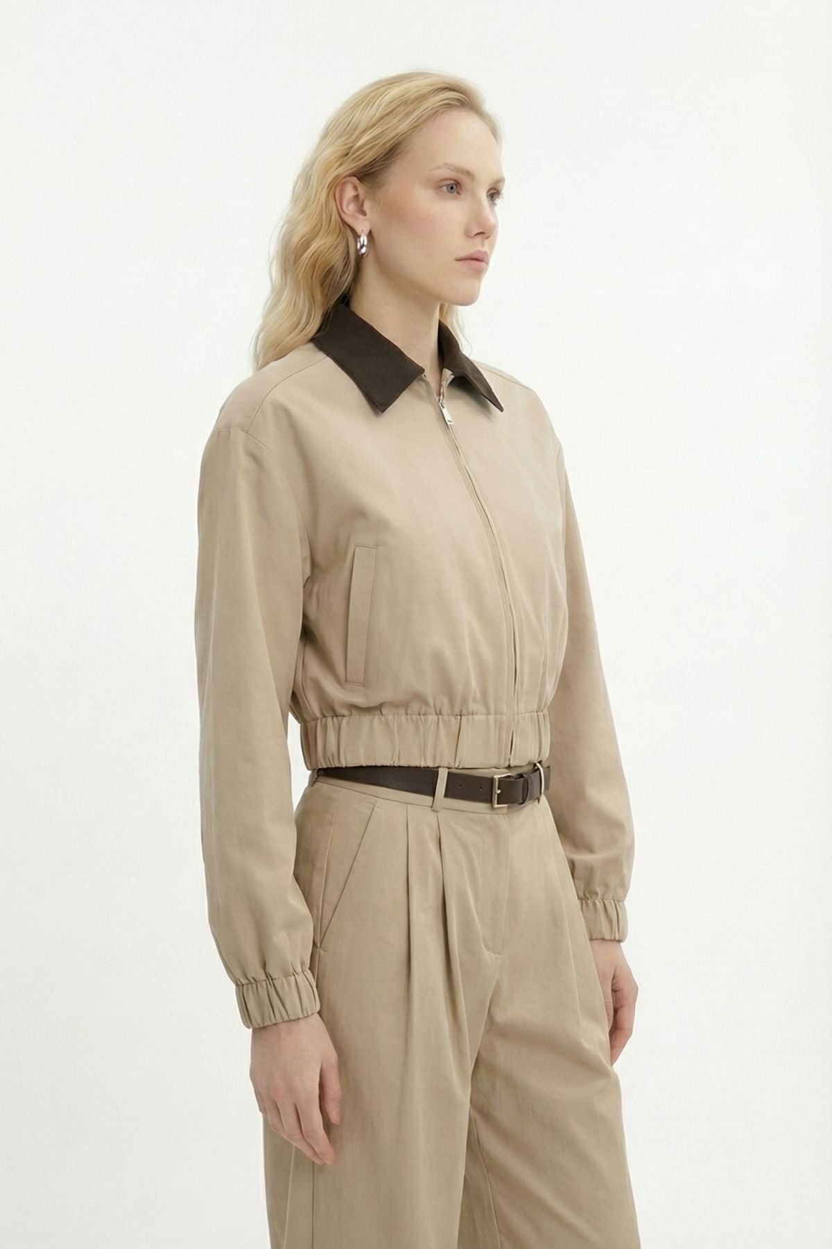 Kontrast Yaka Fermuarlı Bomber Ceket Bej