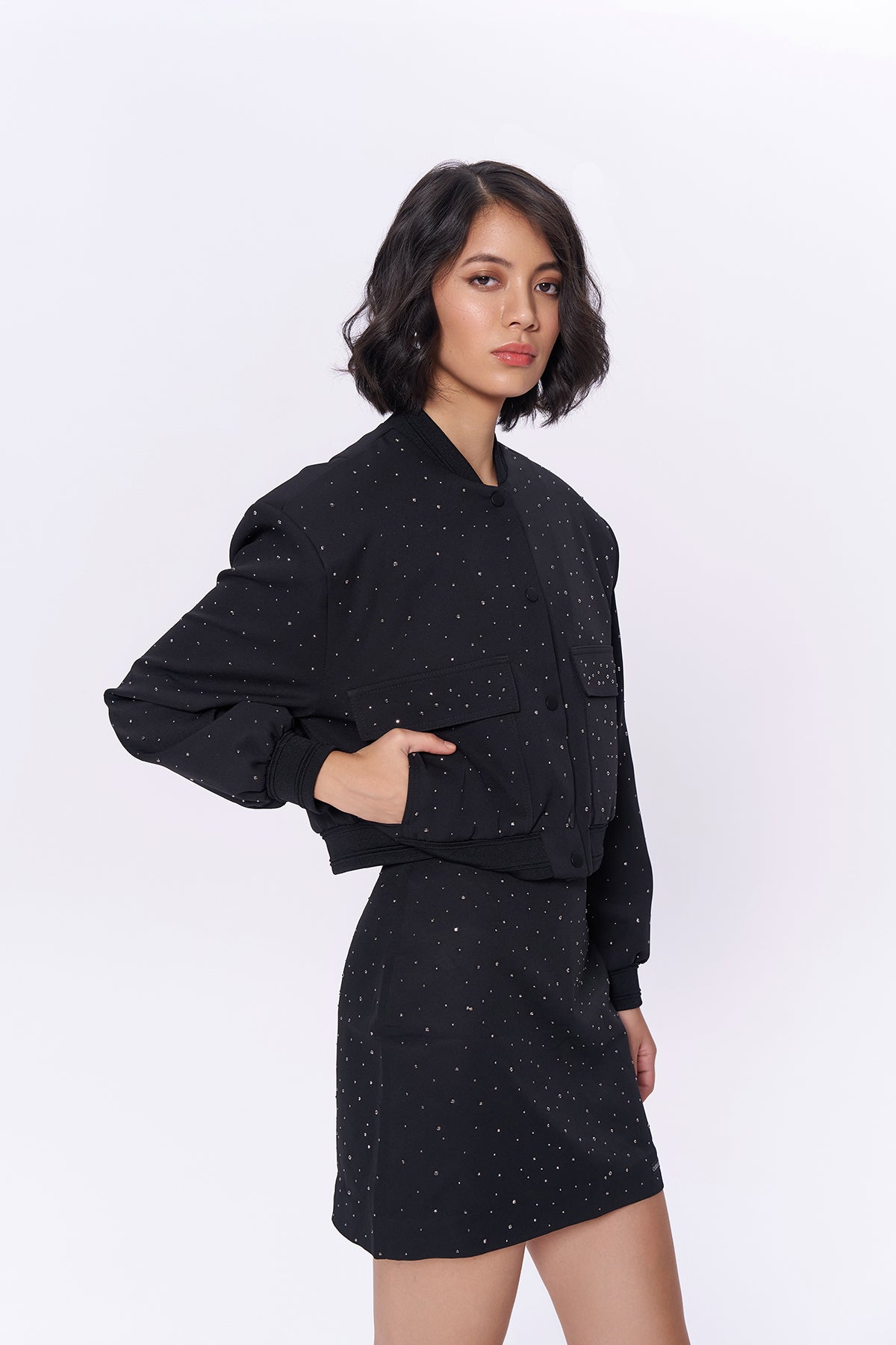 Mini Parlak Taş Vatkalı Bomber Ceket Siyah