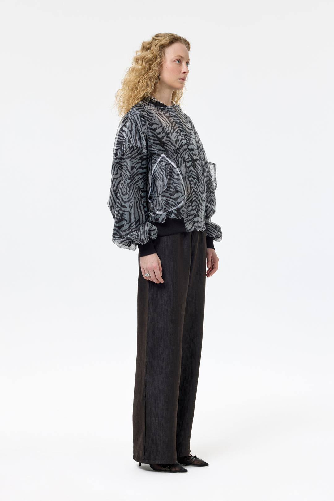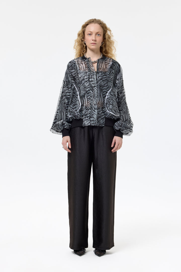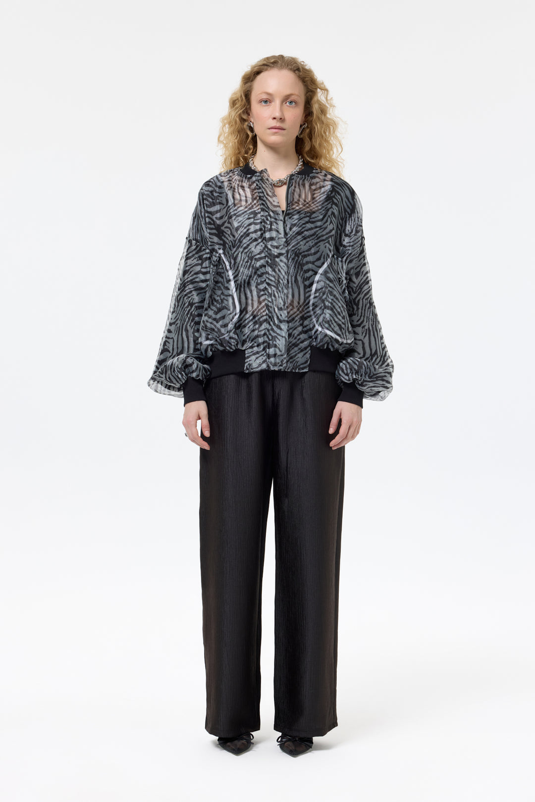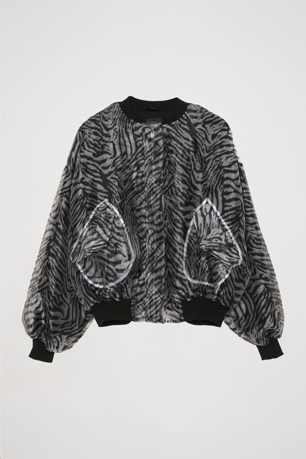 Zebra desenli, balon kollu, ribana manşet detaylı, çift cepli, organze tül detaylı, fermuar kapamalı, oversize bomber ceket.