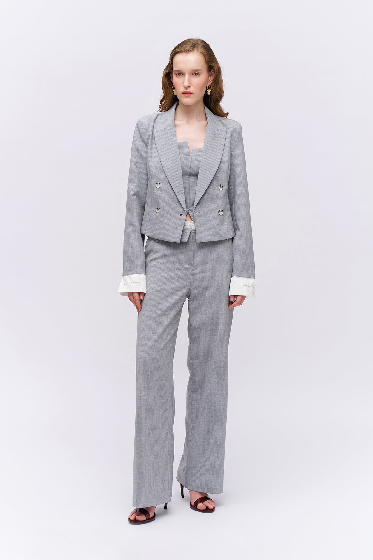 Kumaş Match Detaylı Çizgili Blazer Ceket Gri