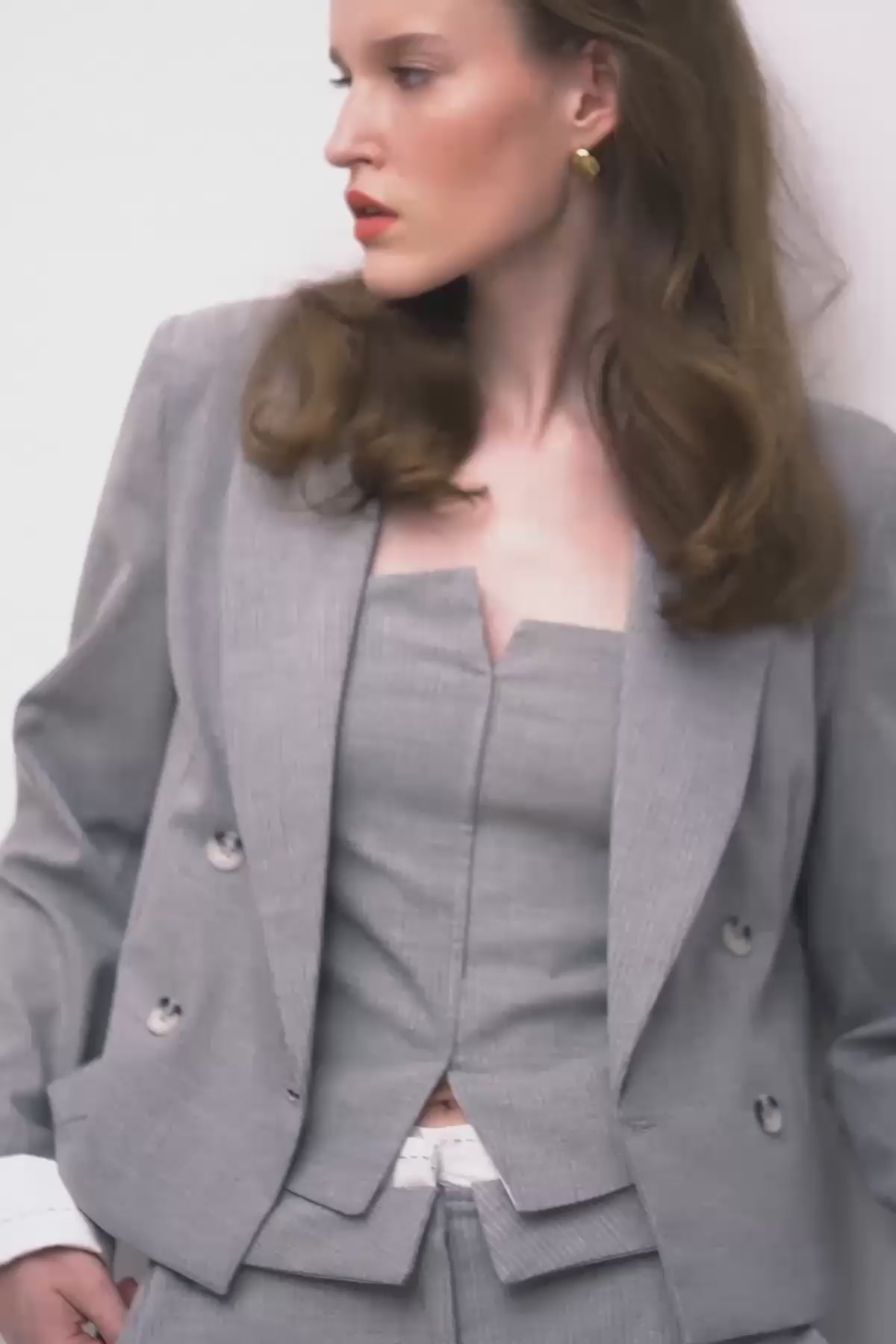 Kumaş match detaylı, içi astarlı, çizgili, düğmeli, kısa blazer ceket.