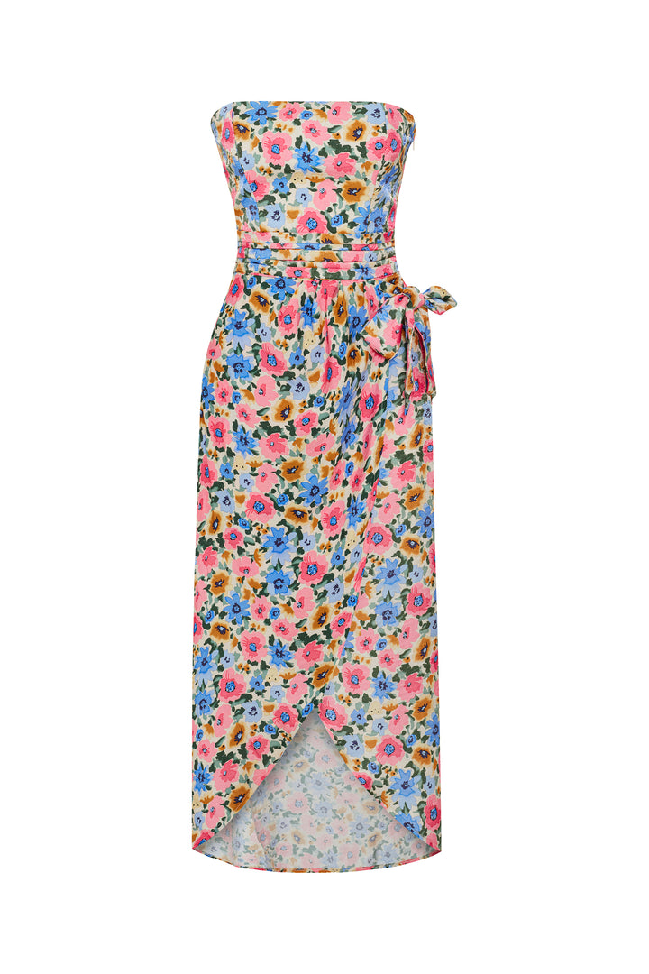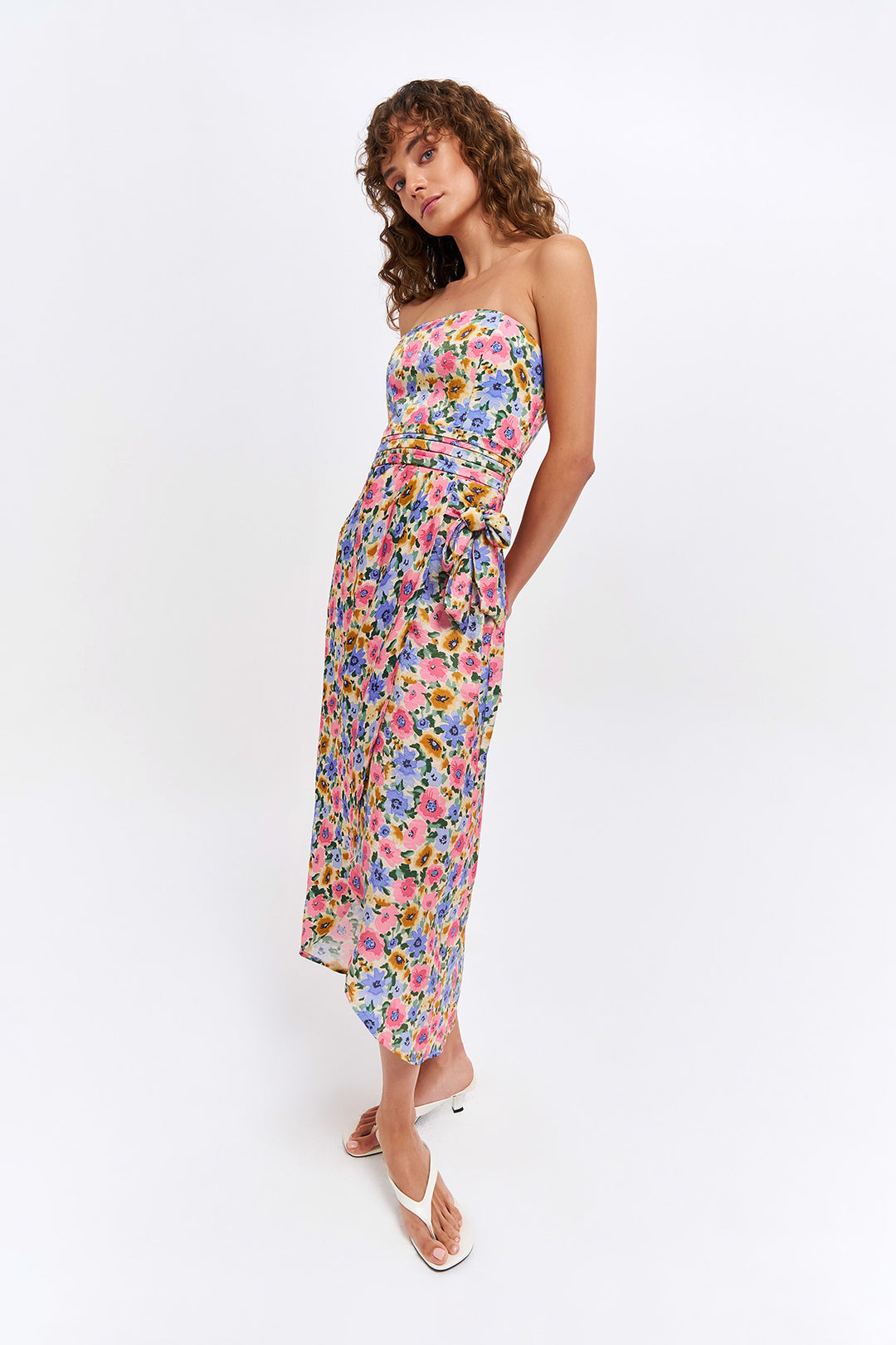 Straplez, çiçek desenli, anvelop detay, midi boy elbise.