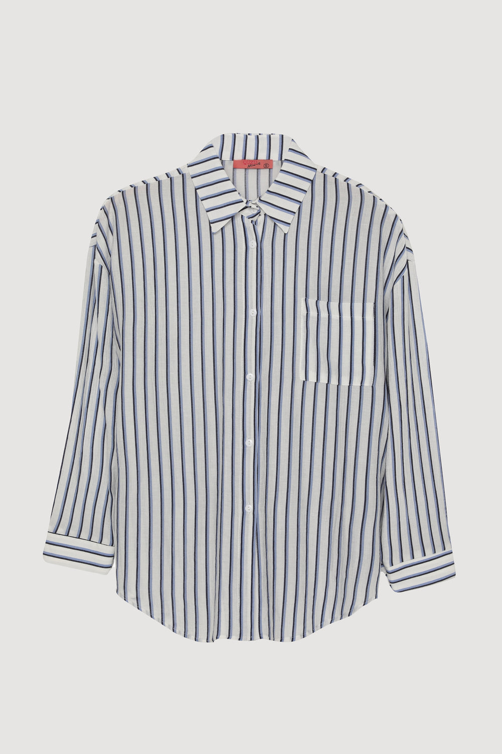 Dikey renkli çizgi desenli, klasik gömlek yaka, uzun kollu, ön cep detaylı, düğme kapamalı, rahat kesim gömlek.