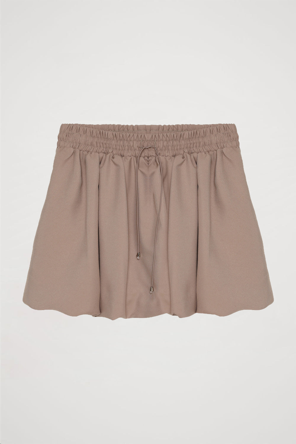Bel kısmı lastikli ve büzgü detaylı, içi astarlı, çift cepli, günlük ve sportif görünüm sunan mini boy balon etek.
