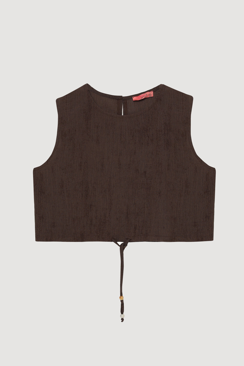 Büzgü Detaylı Bağcıklı Kolsuz Bluz Kahverengi