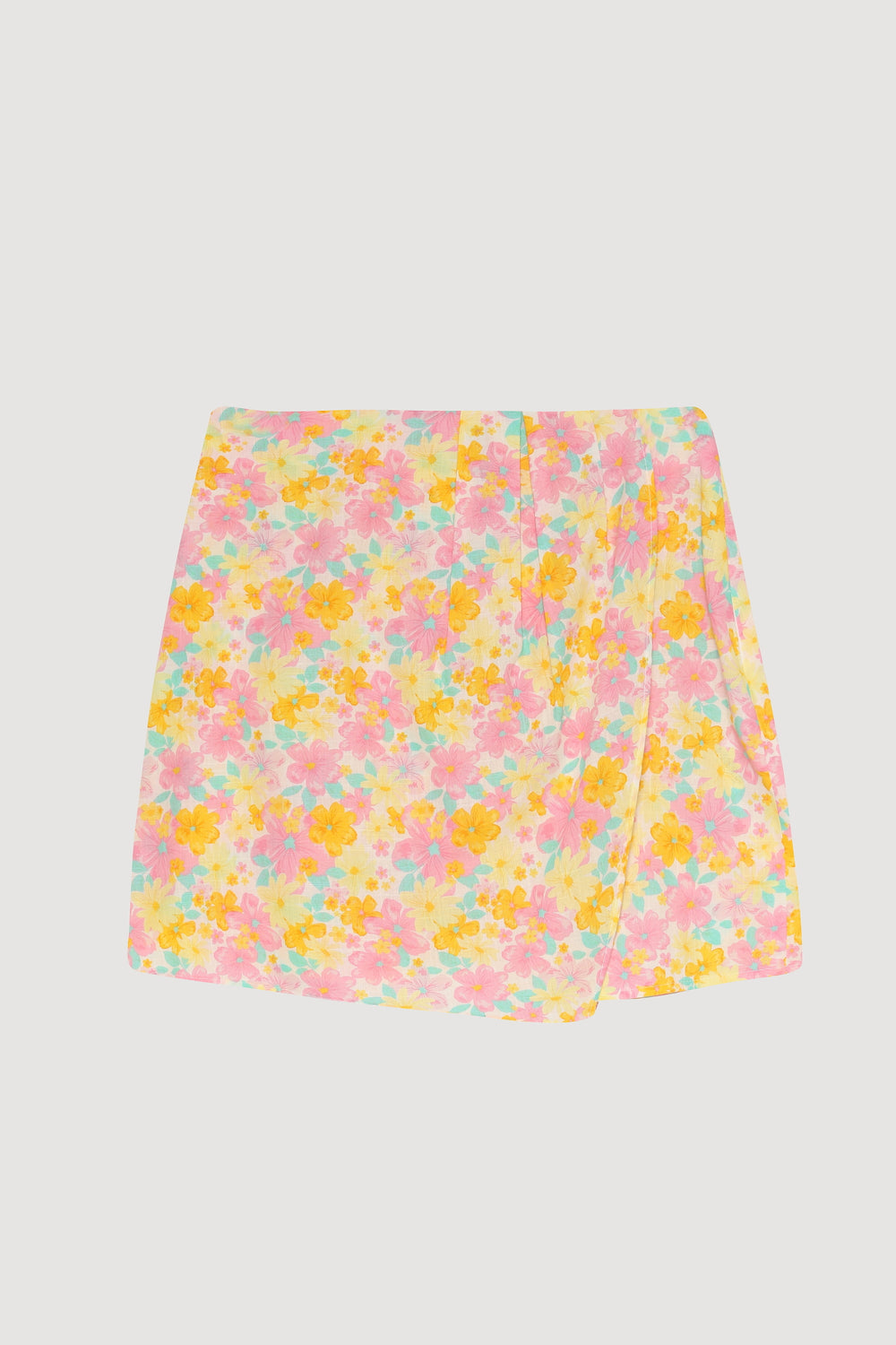 Önü pile detaylı, belden oturtmalı, yandan fermuar kapamalı, renkli çiçek desenli, modern görünümlü mini boy etek.