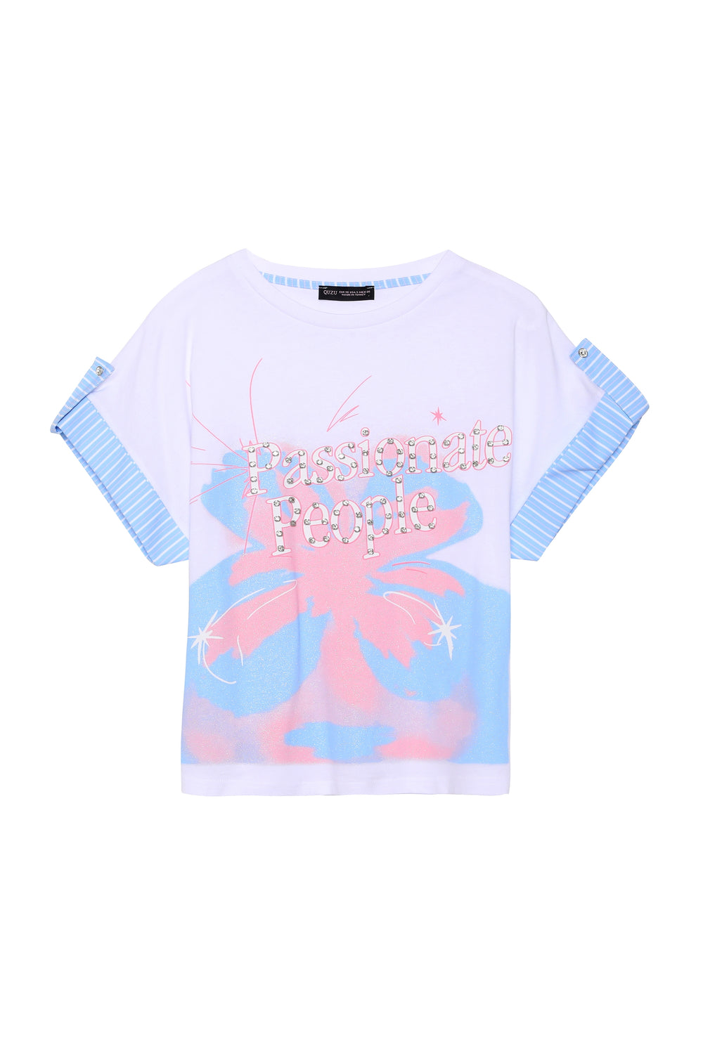 Çizgili Kol Detaylı Taşlı Tişört Beyaz