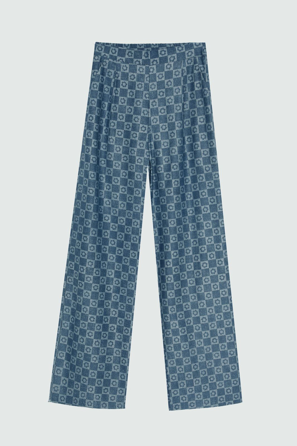 Denim görünümlü kumaştan, dama desenli, yüksek bel, cepli, yandan fermuar kapamalı, rahat kalıp, bol paça pantolon.