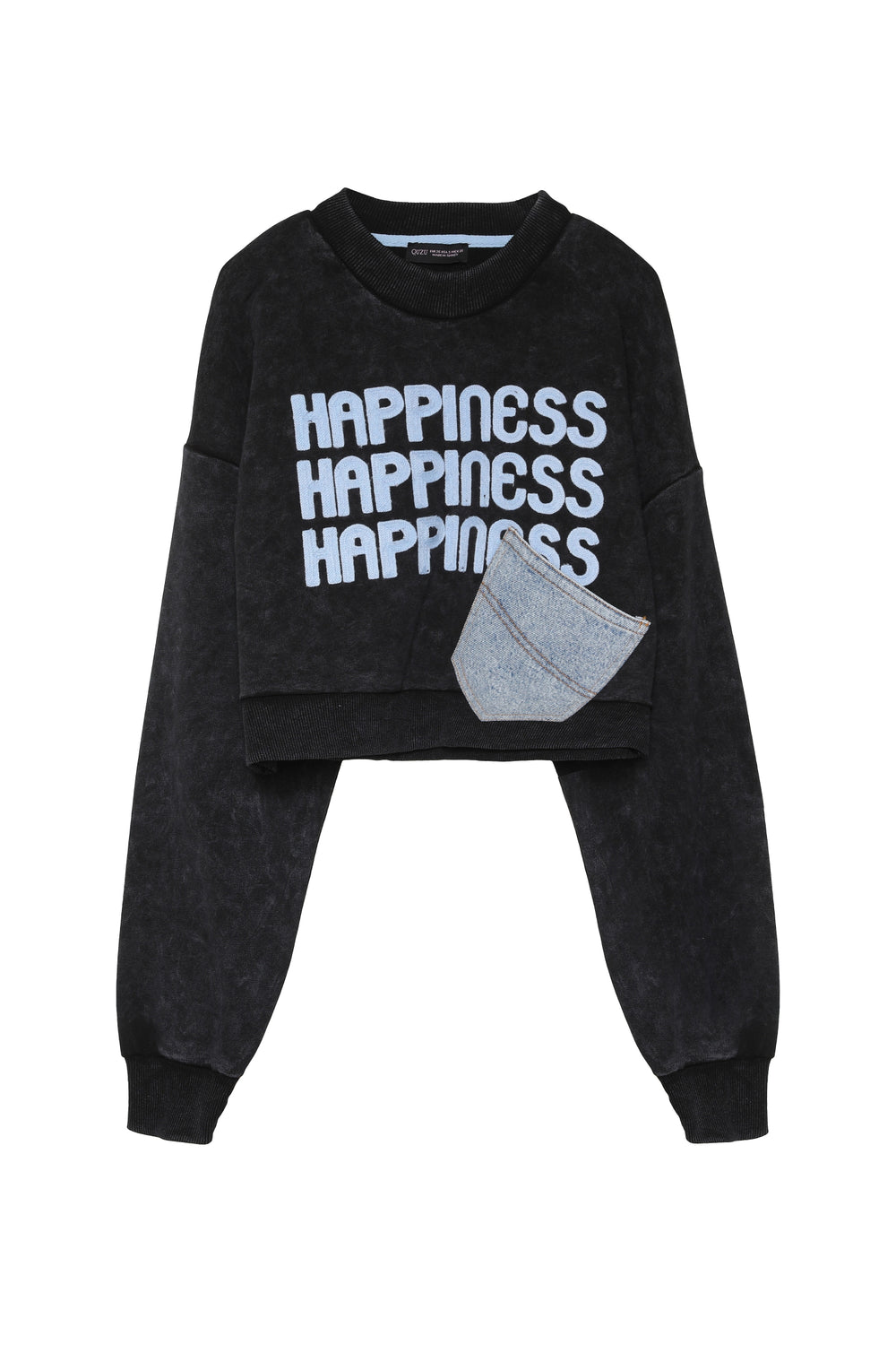 Uzun kollu, bisiklet yaka, yıkama baskılı, kot cep detaylı sweatshirt.