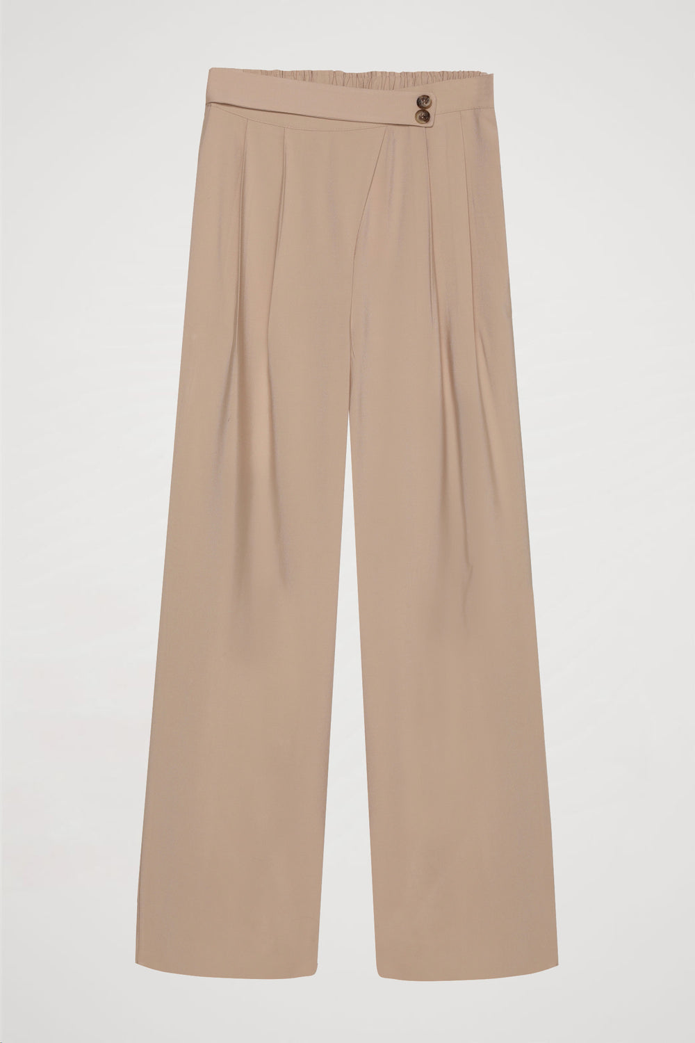 Yüksek bel, rahat kesim, önü pile detaylı, geniş paçalı, iki düğme kapama detaylı pantolon.