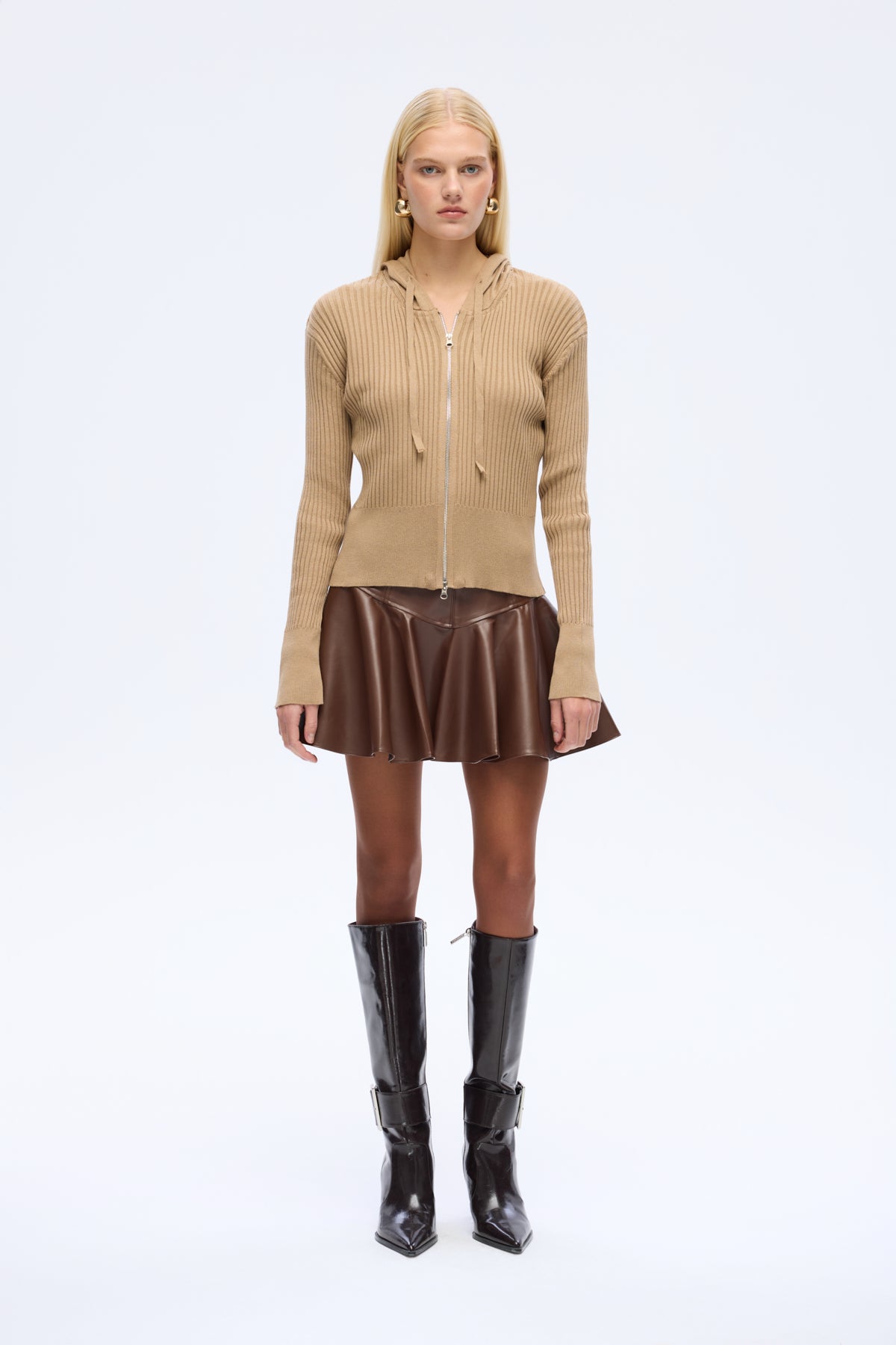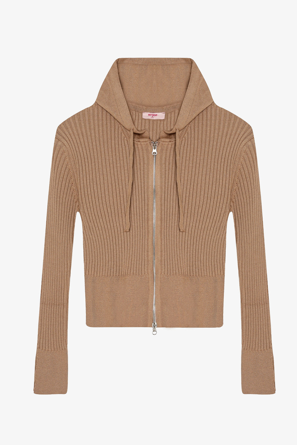 Fermuarlı Kapüşonlu Triko Hırka Vizon