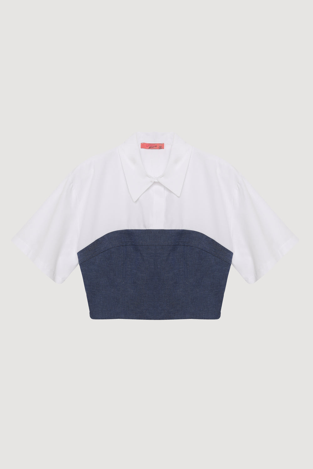 Üst kısmı gömlek yaka detaylı, kısa kollu, yandan fermuar kapamalı, yanları çift şerit yazı detaylı, alt kısmı denim kumaş görünümlü, crop boy bluz.