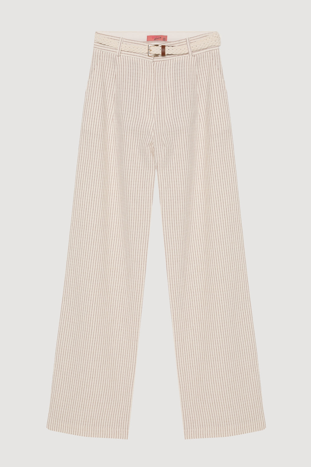 Hasır Kemerli İnce Çizgili Keten Pantolon Naturel