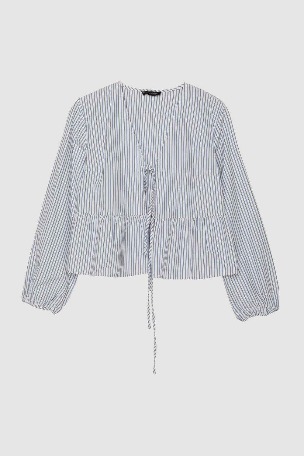 V yaka, ön kısmı bağcıklı bağlamalı, uzun kollu, lastik detaylı bilekler, volanlı etek ucu, çizgili desenli şık bluz.