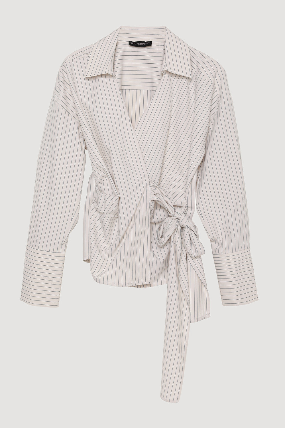 Çizgili desenli, kruvaze yaka, uzun kollu, geniş manşetli, kuşak bağlamalı, yanı drape detaylı, modern ve şık görünümlü bluz.