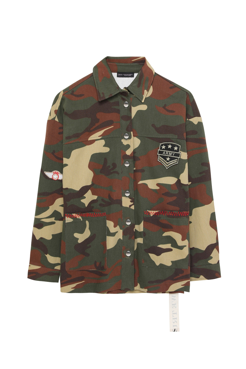 %100 Pamuklu, çift cepli, uzun kollu, nakış detaylı, kamuflaj desenli, oversize düğmeli gömlek.