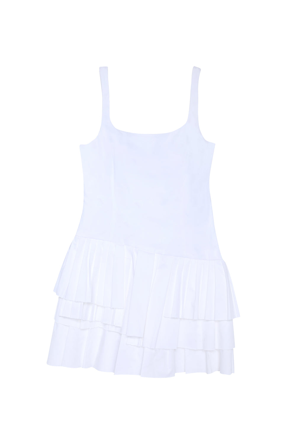 Kare yaka, kalın askılı, asimetrik, pilise etek detaylı, mini boy elbise.