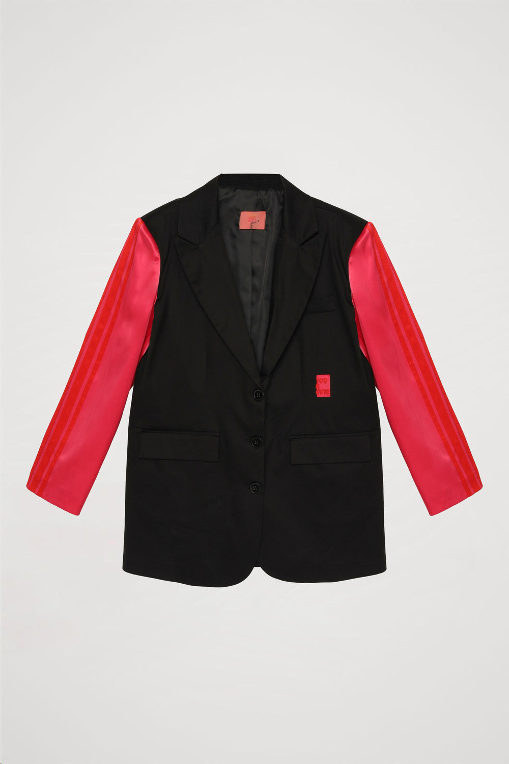 İçi kendi renginden astarlı, kontrast saten renk uzun kollu, v yaka, düğme kapamalı, kolları şerit çizgili, cepli oversize blazer ceket.