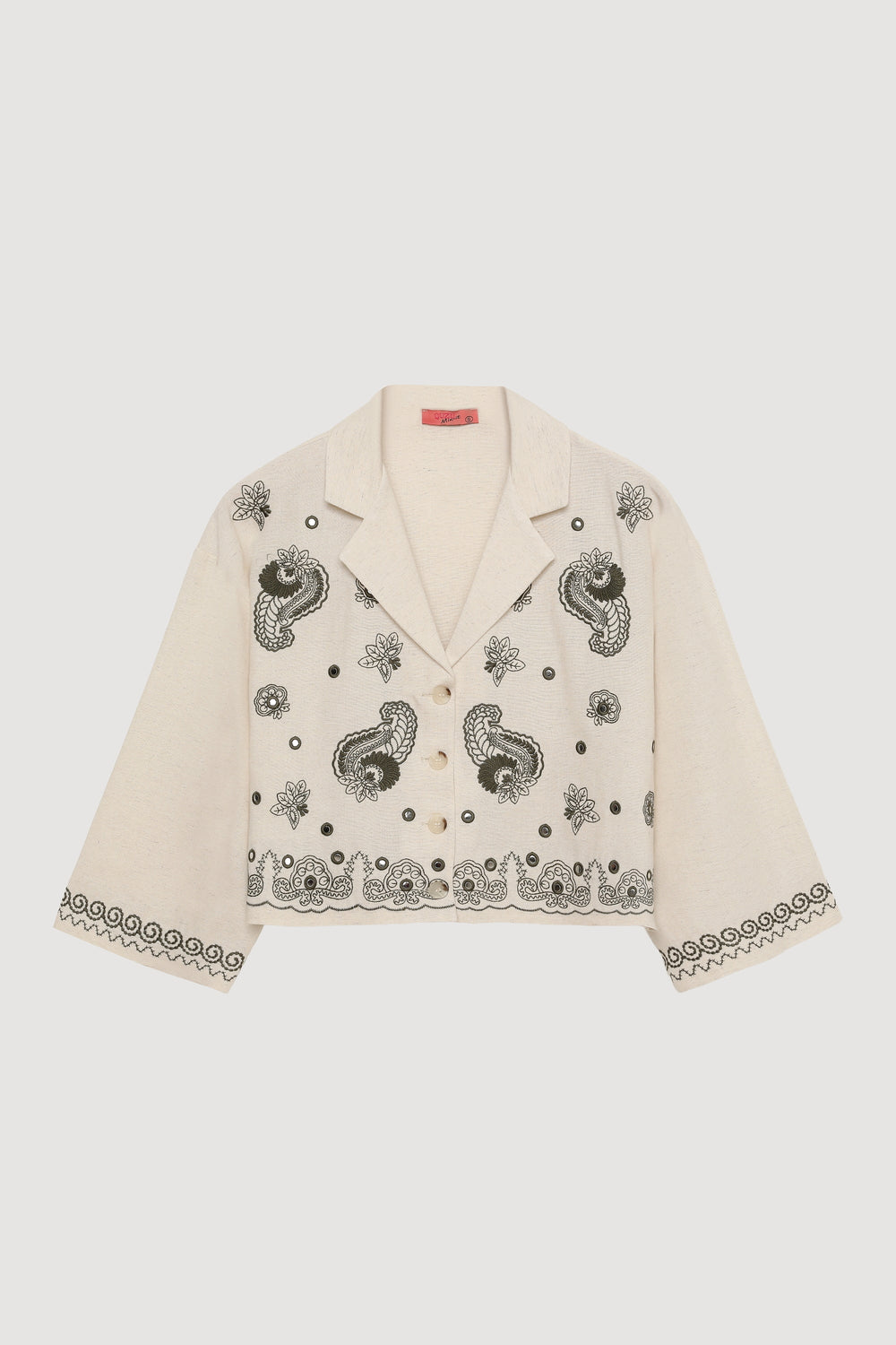 Geniş yakalı, astarsız, önden düğme kapamalı, etnik desenli nakış işlemeli, yarım kol, crop boy keten gömlek.