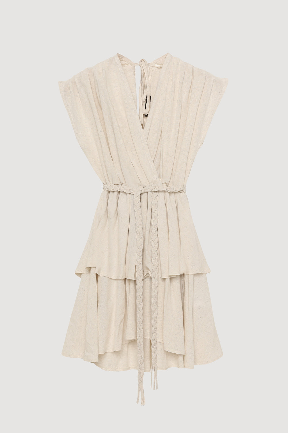 Omzu büzgü detaylı, boyunu sırttan ip bağlamalı, kolsuz, v yaka kruvaze kesimli, büzgülü ip kuşak bağlama detaylı, kat kat volanlı mini boy elbise.