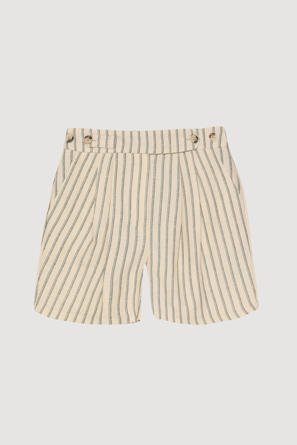 Dikine çizgili desenli, beli pens detaylı, fermuar ve düğme kapamalı, yandan çift cepli, beli düğme aksesuarlı, yüksek bel, mini boy keten şort.
