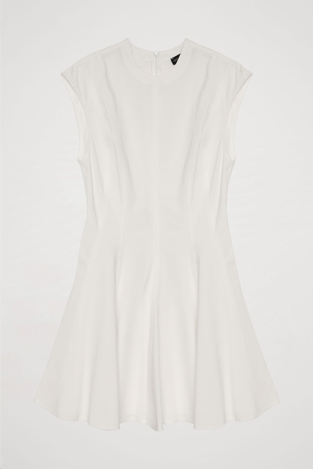 Yuvarlak yakalı, kolsuz, belden oturmalı, pileli etek detaylı, sırtı fermuar kapamalı, modern ve şık görünüm sunan mini boy elbise.