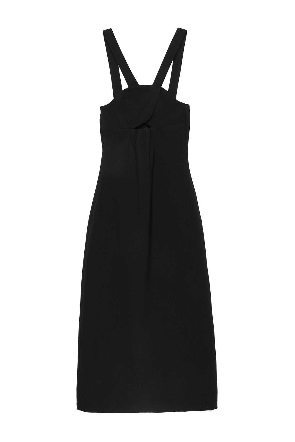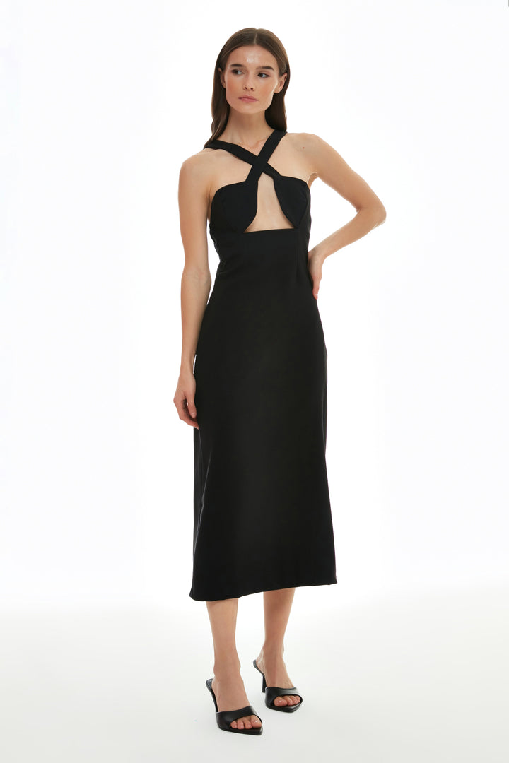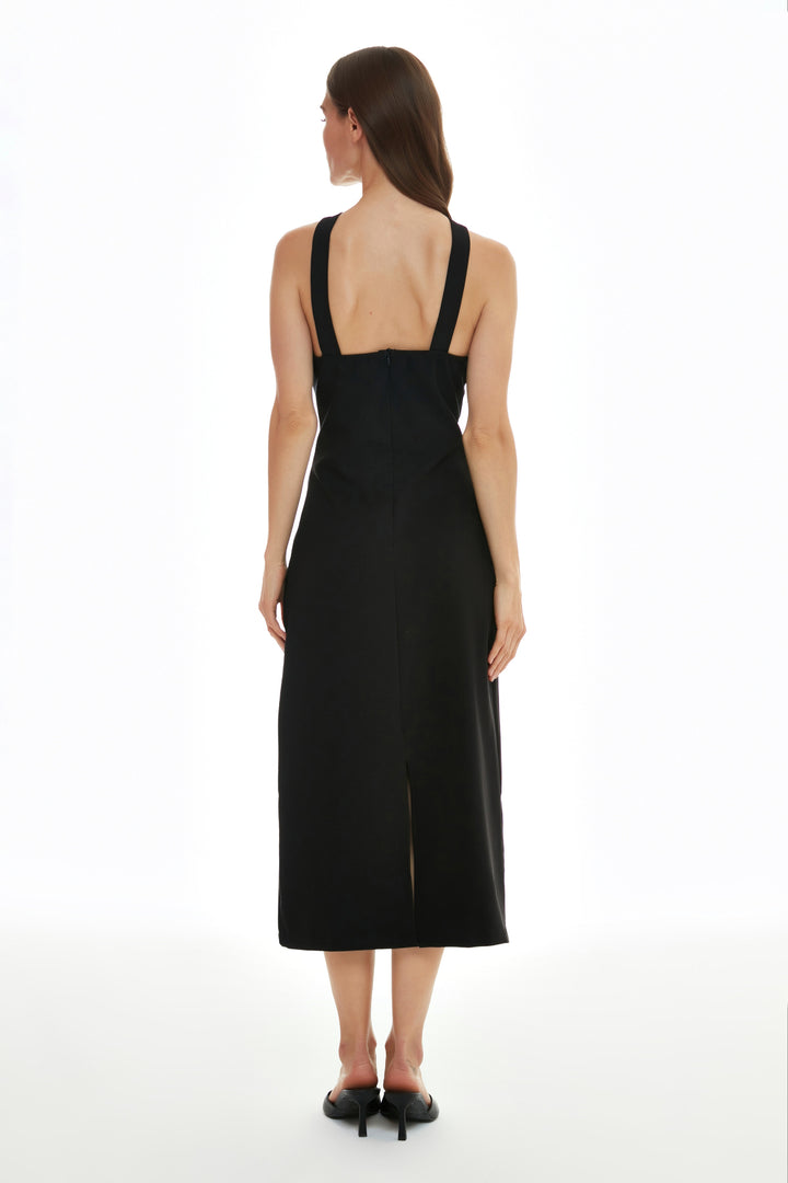 Elastic blend midi dress with concealed zipper on the back, back slit, window detail, diagonal straps on the back