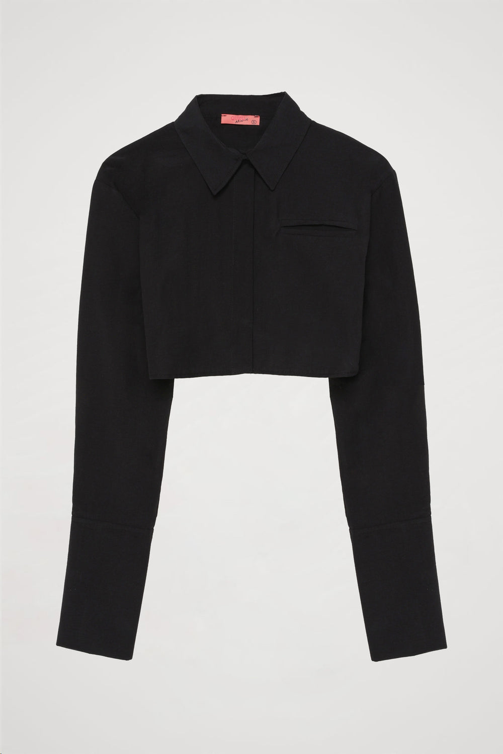 Sırt kısmında toka şeritleriyle açık detaylara sahip, uzun kollu, kolları düğme detaylı, şık bir crop gömlek.