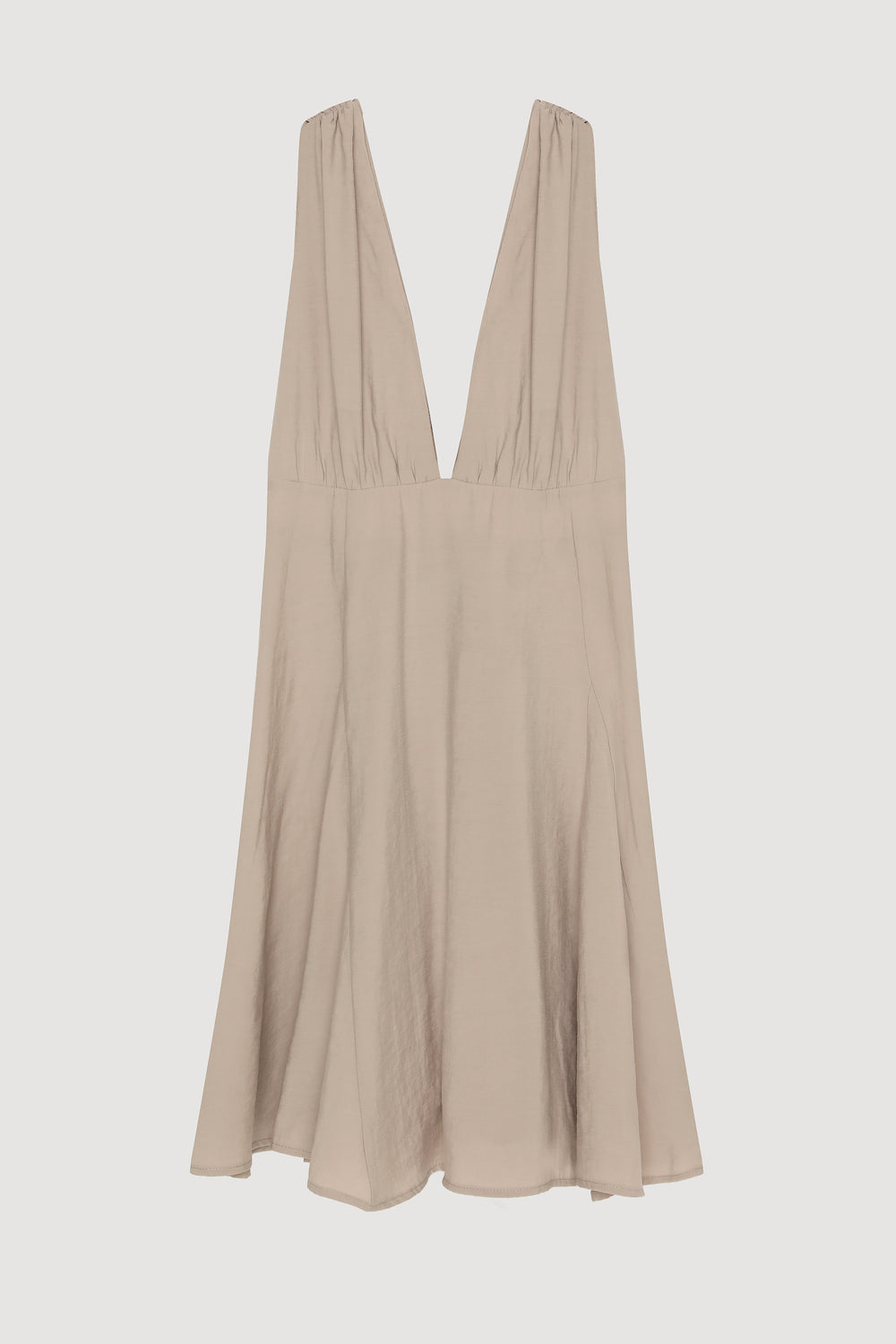 İçi astarsız, derin V yaka, kalın askılı, sırtı kuş gözü boncuk bağlama detaylı, kloş kesim piliseli, mini boy elbise.