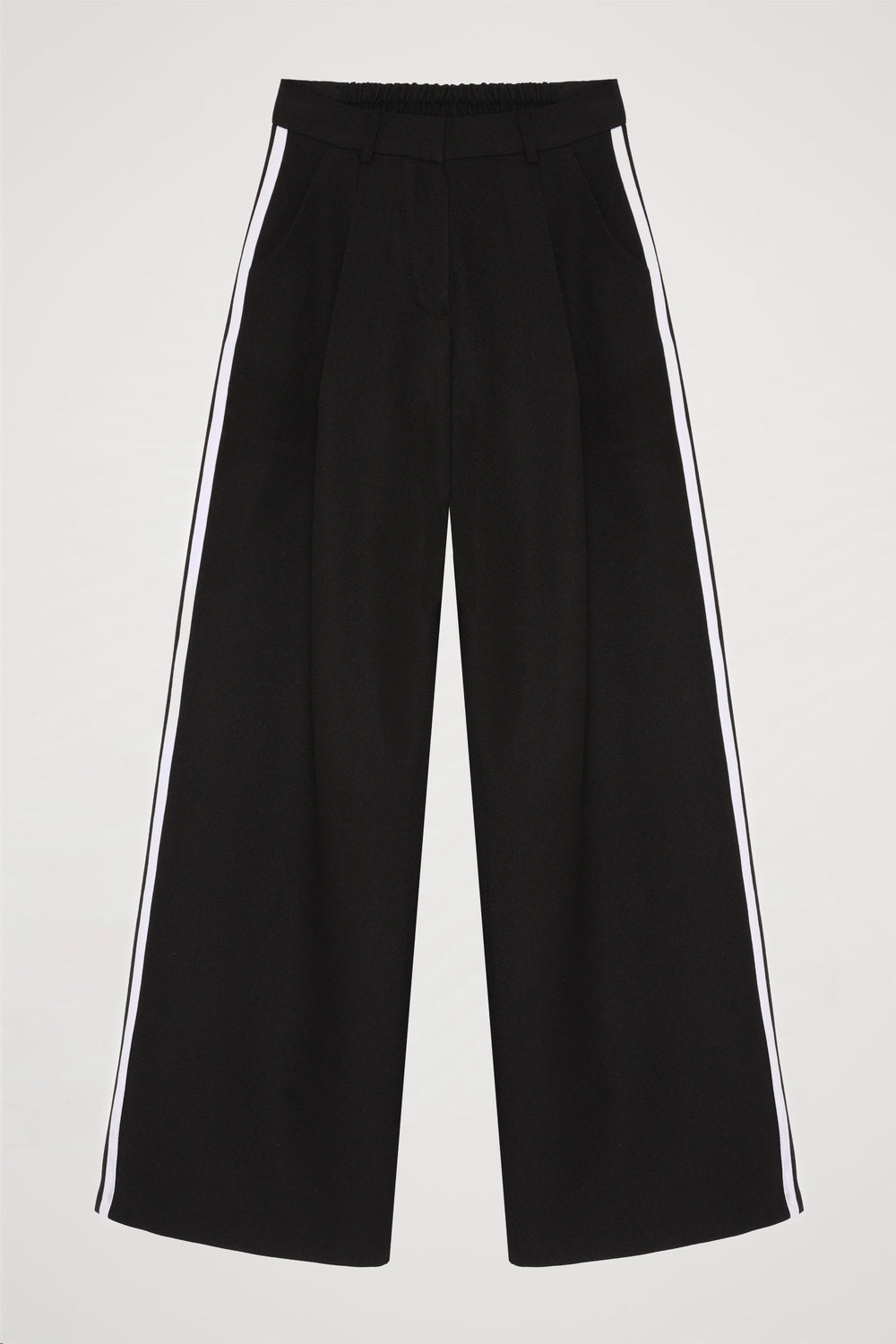 Yanı çift şerit detaylı, yüksek bel, arka beli lastikli, çift cepli, fermuar ve kanca kapamalı, modern ve şık görünümlü panyolon.