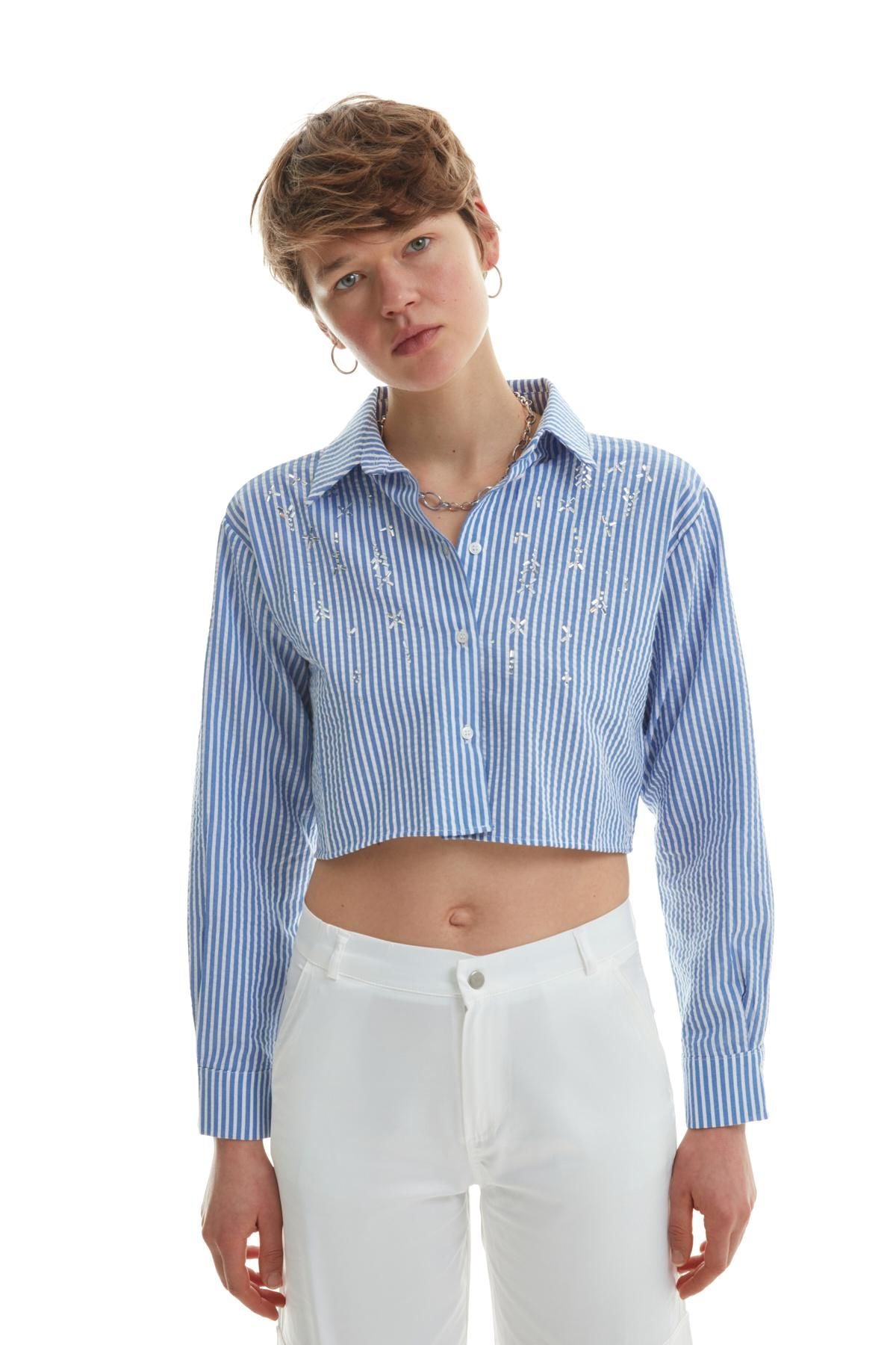 Viscose, long sleeve, striped, oversized cut, cropped shirt with shiny stone embroidery on the front.