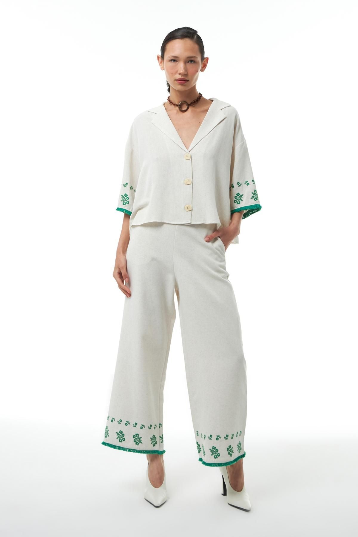 The linen shirt model in neutral colors, designed specifically for the season, offers both a light feeling and a comfortable wear with its linen, cotton and viscose blend content and comfortable cut. When you combine it with our trousers model of the same color and texture, you can create both a beach style and a perfect summer combination. You can gain a bohemian flair when you combine the crop shirt model, which offers both a modern and ethnic style with its embroidery, with our trousers model with the same embroidery. Embroidery embroidery of the oversize shirt model draws all the attention in embroidery and offers simplicity with its color.