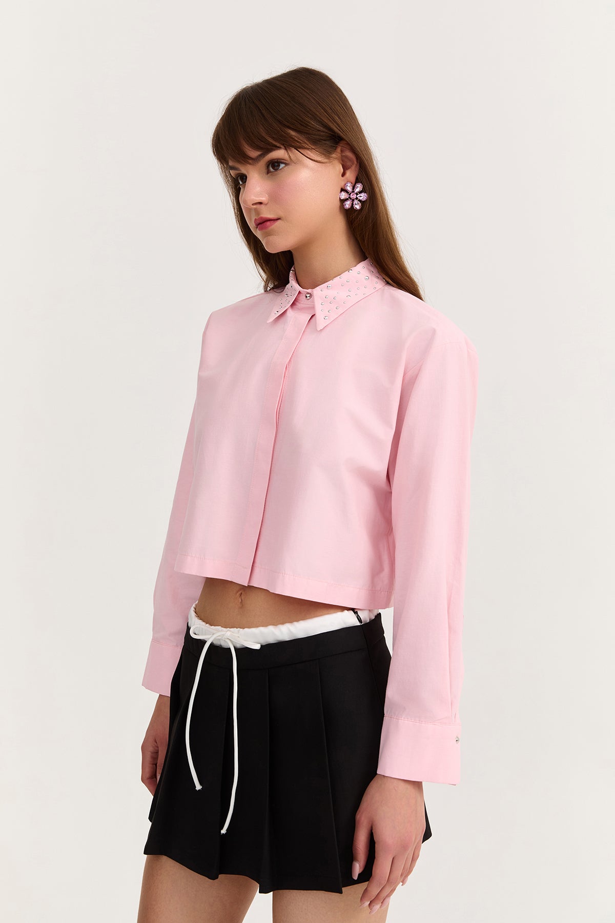Trok Yaka Detaylı Crop Gömlek Pembe