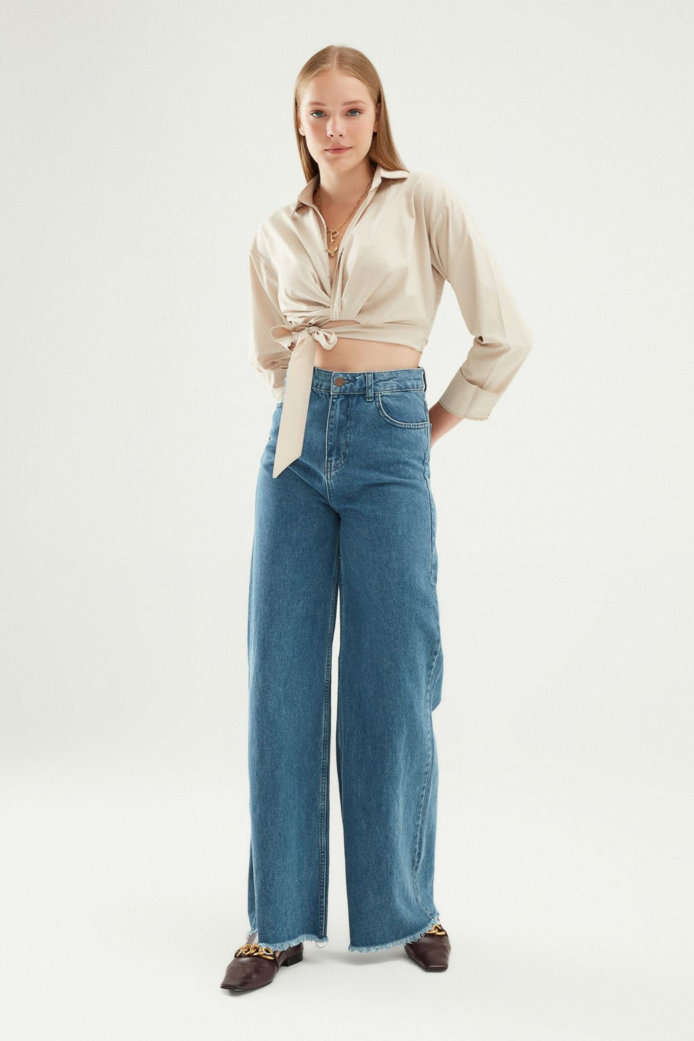 Tie Front Crop Shirt Stone