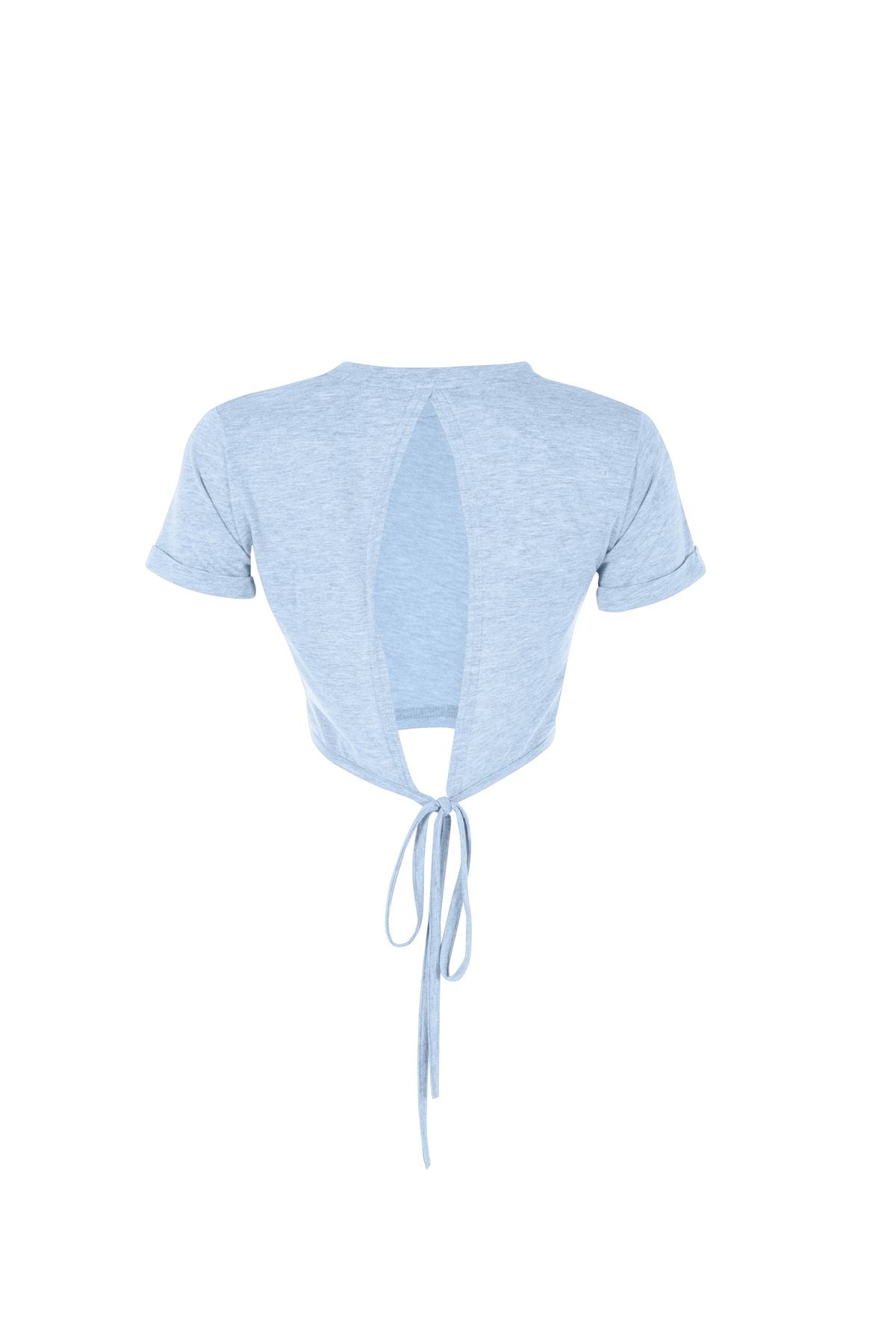 The t-shirt with rib detail on the collar and double cuff makes the waist tightness adjustable with its tie detail feature. Another detail of the t-shirt is the open back.
