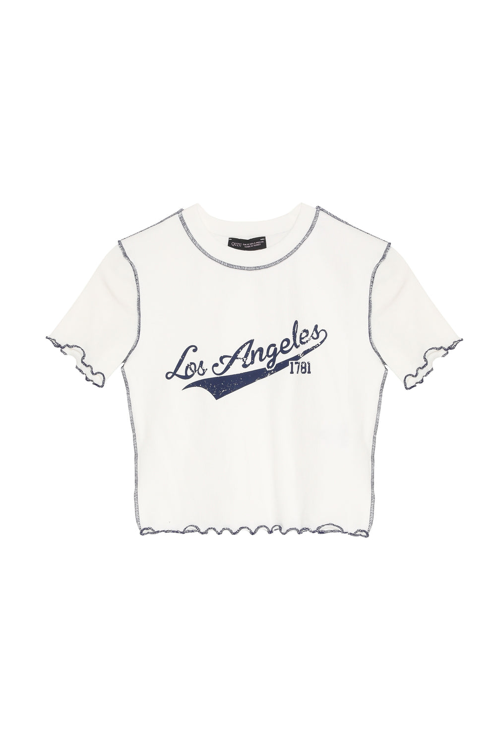 Dikiş Detaylı Baskılı Crop Tişört Ekru