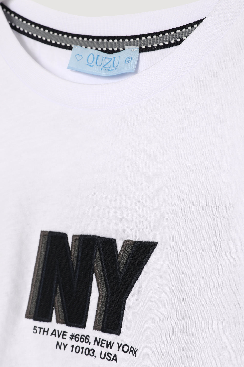 Ön ve arka kısmı "NY" baskılı, kısa kollu, omuzlarda biyeli şerit detayı bulunan, bisiklet yaka, crop boy tişört.